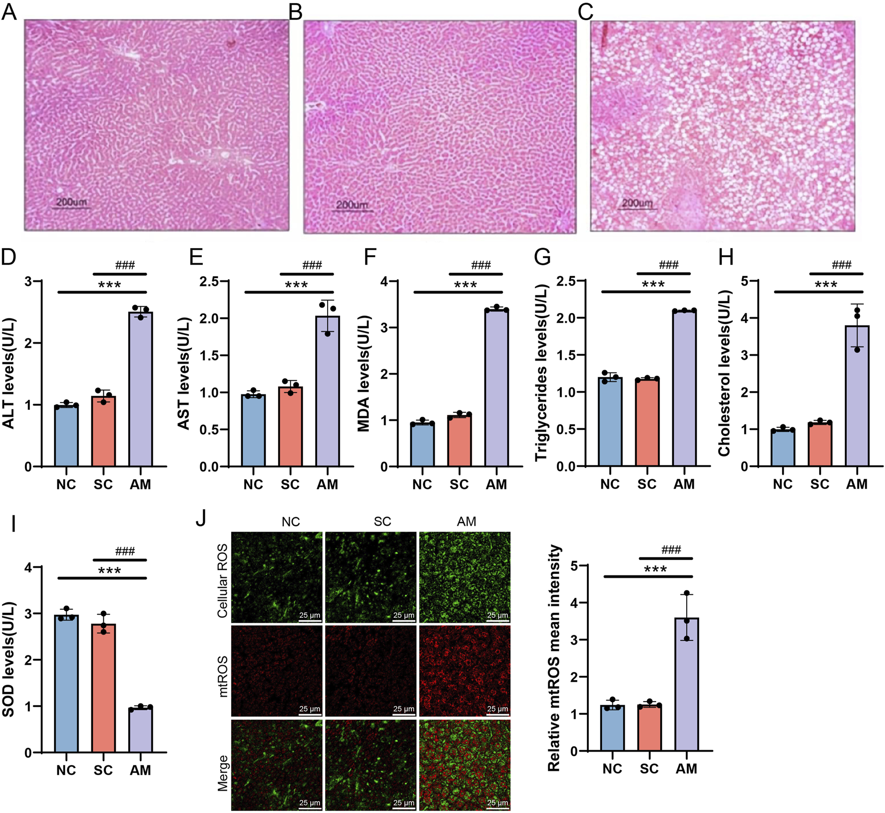 Histological changes in the livers of AFLD rats (H&E staining, scale bar = 200 μm). Note: (A) Normal control group, showing no significant fat accumulation. (B) The sucrose solution group showed no fat droplets. (C) The ethanol intake group showed severe tissue vacuolation and significant fat droplet accumulation. (D–I) Serum biochemical analysis; (J) ROS detection. Compared to the normal control group, * indicates P < 0.05, ** indicates P < 0.01, and *** indicates P < 0.001, indicating significant differences as determined by the least significant difference (LSD) test. Compared to the sucrose solution group, # indicates P < 0.05, ## indicates P < 0.01, and ### indicates P < 0.001, also determined by the LSD test. All experiments were repeated three times.