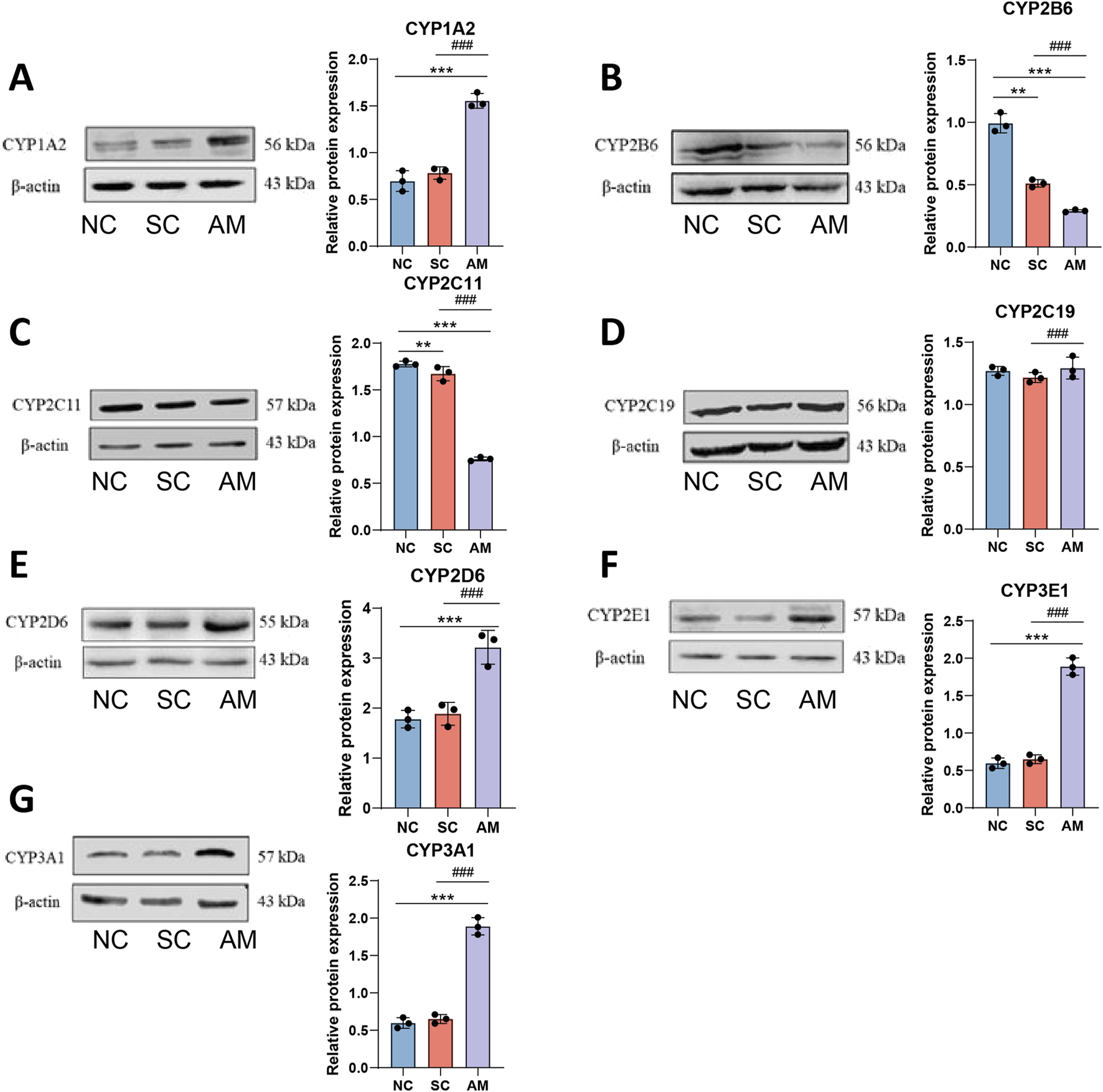 Relative protein expression levels of CYP450 enzymes in the livers of AFLD rats. Note: (A) Protein level of CYP1A2 in rat liver tissue; (B) Protein level of CYP2B6 in rat liver tissue; (C) Protein level of CYP2C11 in rat liver tissue; (D) Protein level of CYP2C19 in rat liver tissue; (E) Protein level of CYP2D6 in rat liver tissue; (F) Protein level of CYP3E1 in rat liver tissue; (G) Protein level of CYP3A1 in rat liver tissue. Compared to the normal control group, * indicates P < 0.05, ** indicates P < 0.01, and *** indicates P < 0.001, indicating significant differences as determined by the LSD test. Compared to the sucrose solution group, # indicates P < 0.05, ## indicates P < 0.01, and ### indicates P < 0.001, also determined by the LSD test. All experiments were repeated three times.