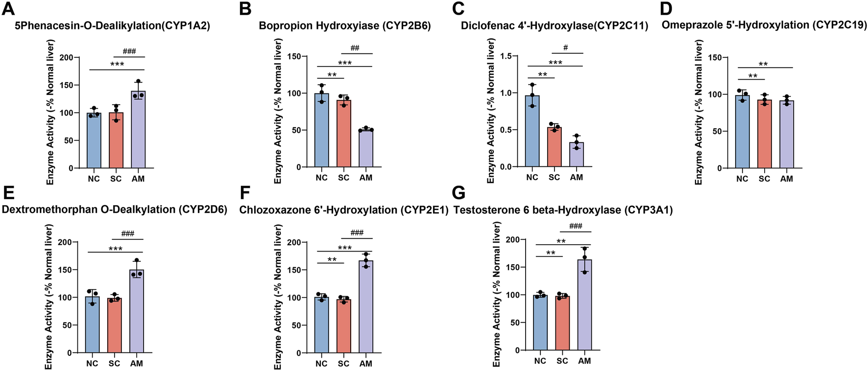 Enzyme activity of CYP450 enzymes in microsomes of AFLD rats. Note: (A) Enzyme activity of CYP1A2 in rat liver tissue; (B) Enzyme activity of CYP2B6 in rat liver tissue; (C) Enzyme activity of CYP2C11 in rat liver tissue; (D) Enzyme activity of CYP2C19 in rat liver tissue; (E) Enzyme activity of CYP2E1 in rat liver tissue; (F) Enzyme activity of CYP3A1 in rat liver tissue; (G) Enzyme activity of CYP3A1 in rat liver tissue. Compared to the normal control group, * indicates P < 0.05, ** indicates P < 0.01, and *** indicates P < 0.001, indicating significant differences as determined by the LSD test. Compared to the sucrose solution group, # indicates P < 0.05, ## indicates P < 0.01, and ### indicates P < 0.001, also determined by the LSD test. All experiments were repeated three times.