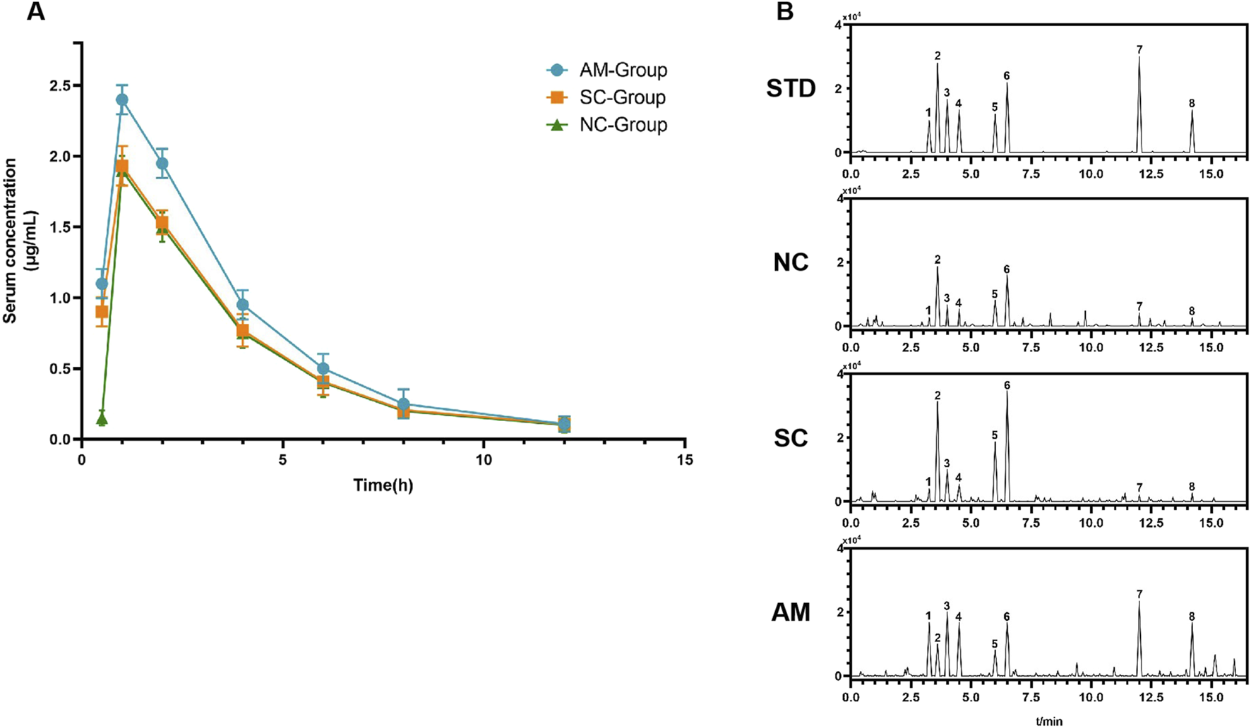 Serum drug concentration and metabolite profiles in different treatment groups after administration. Note: (A) Changes in serum drug concentration over time in the NC group (normal control), SC group (sucrose group), and AM group (ethanol group) post-administration. Data for each group are presented as mean ± standard error (n = 15). (B) High-performance liquid chromatography (HPLC) mass spectra of the rats in each group: STD: Standard spectrum used for peak identification of metabolites. NC: Mass spectrum of the control group showing baseline metabolite concentrations. SC: Mass spectrum of the sucrose group showing significant peaks for glucose and fructose as direct metabolic products of sucrose. AM: Mass spectrum of the ethanol group displaying high and sustained concentrations of ethanol and its main metabolites, acetaldehyde and acetic acid, as well as peaks for ethyl palmitate and ethyl oleate. Peaks for the main metabolites are labeled in the HPLC chromatograms as follows: 1-acetaldehyde, 2-pyruvic acid, 3-lactic acid, 4-acetic acid, 5-fructose, 6-glucose, 7-ethyl palmitate, 8-ethyl oleate.