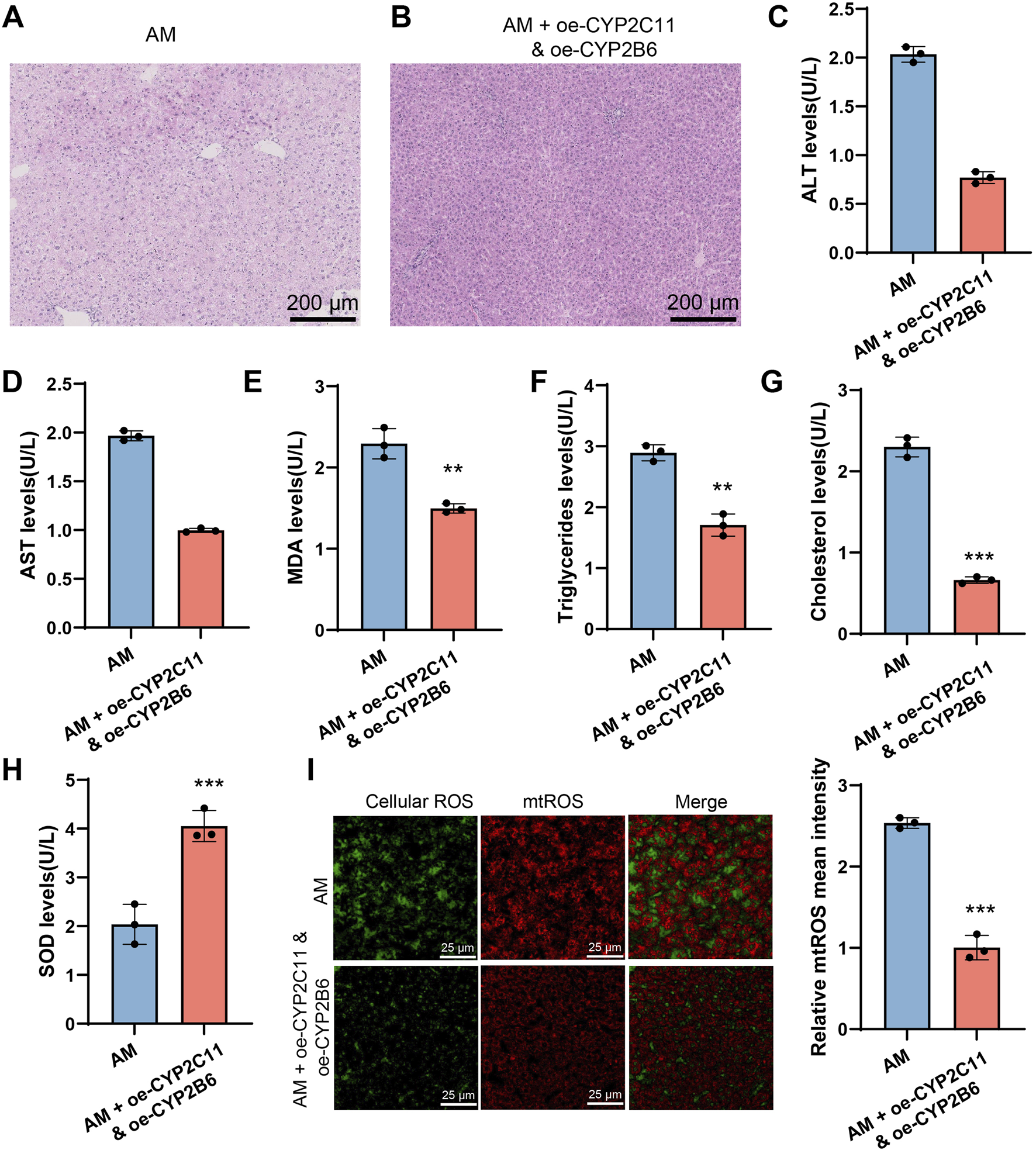 CYP2C11 and CYP2B6 Overexpression Reduces Lipid Accumulation and Oxidative Stress in AFLD. Note: (A-B) Severe tissue vacuolation and significant lipid droplet accumulation were observed in the ethanol intake group, while no lipid droplets were present in the group with simultaneous overexpression of CYP2C11 and CYP2B6. (C–H) Serum biochemical analysis. (I) ROS detection. All experiments were repeated three times. ***P < 0.001, **P < 0.01, *P < 0.05, indicating significant differences between groups.