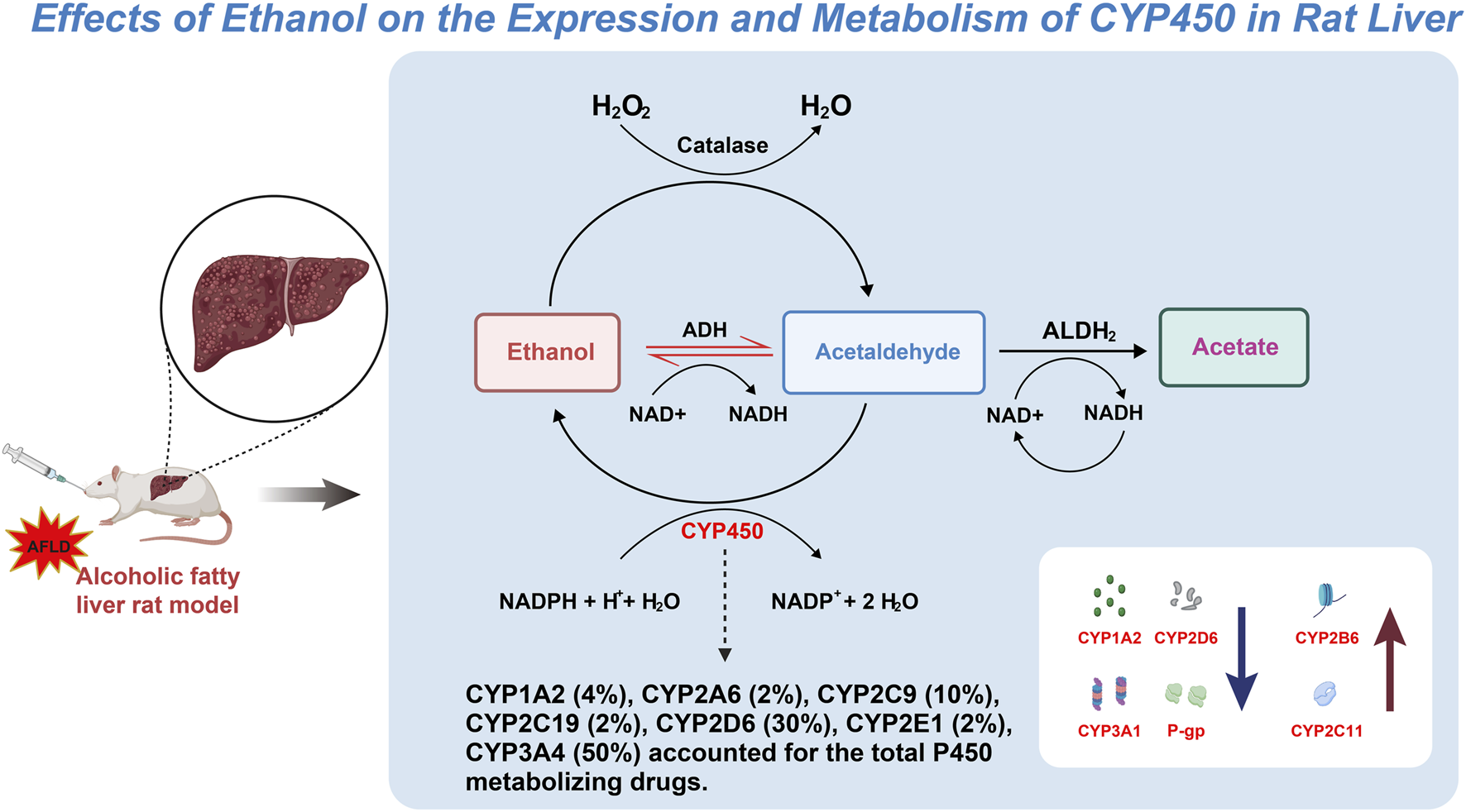 Significant alterations were identified in the expression and activity of CYP2E1, CYP2D6, and CYP3A1, which were associated with increased lipid accumulation and oxidative stress in the liver. Additionally, the expression of P-glycoprotein (P-gp) was elevated, suggesting that chronic alcohol intake may impact drug transport and excretion.