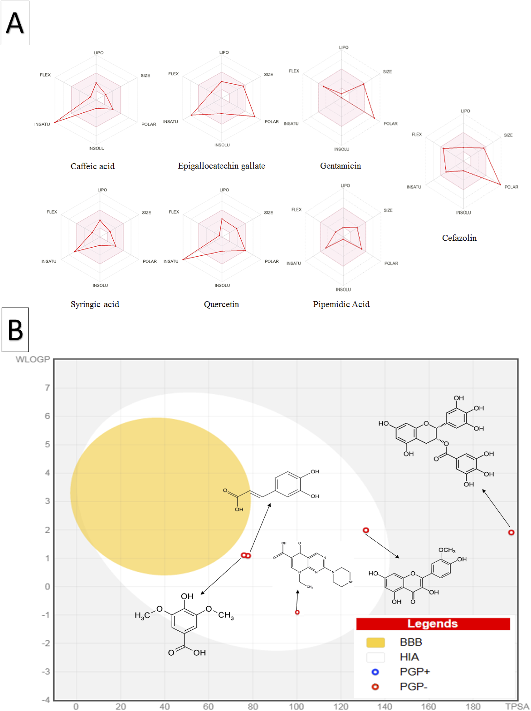 Oral bioavailability and blood-brain barrier absorption analysis of C. sinensis polyphenolic compounds and standard antibiotics using the SwissADME database (A) The coloured zone in the oral bioavailability radar plot represents the optimal physicochemical space for oral bioavailability, the red line depicts the properties of the compounds (B) The BOILED-Egg plot shows the predicted human blood-brain barrier absorption; the red dots indicate that the molecule is not expected to be effluxed from the central nervous system by p-glycoproteins. Abbreviations: LIPO (lipophilicity), POLAR (polarity), INSOLU (insolubility), INSATU (unsaturation), FLEX (flexibility), BBB (blood-brain barrier), HIA (human intestinal absorption), PGP+ (p-glycoprotein substrate), and PGP- (non-p-glycoprotein substrate).