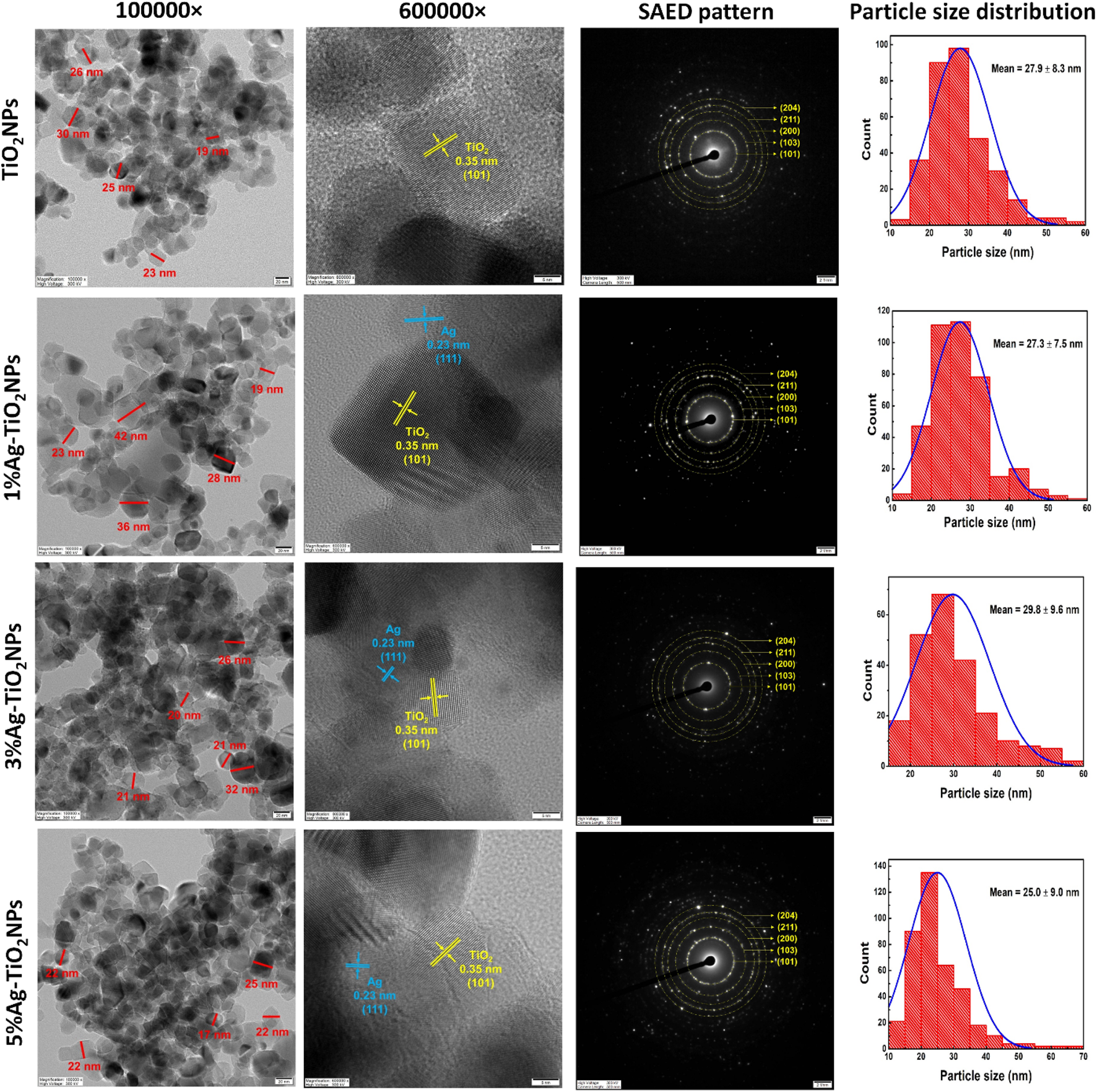The morphology of the NPs was further analyzed using TEM as shown in Figure 5. It can be seen that the TiO2NPs were irregular in shape with sizes mostly between 19 and 30 nm. They were found in aggregates piling on each other. The HRTEM image showed clear lattice fringes with an interplanar spacing of 0.35 nm corresponding to the anatase TiO2 (101) plane. The histogram for particle size distribution showed that the TiO2NPs were in a range between 14.8 and 58.6 nm, with the mean particle size being 27.9 ± 8.3 nm. The larger particle size might be attributed to the agglomeration of the smaller particles. In the case of 1%Ag-TiO2NPs, similar irregular shapes were seen that were between 19 and 42 nm. The particle size histogram showed that the size of 1%Ag-TiO2NPs was between 12.8 and 59.6 nm, with the average being 27.3 ± 7.5 nm. 3%Ag-TiO2NPs and 5%Ag-TiO2NPs were also in aggregation where the size of the particles was predominantly around 20 and 30 nm. The particle size histogram showed that the 3%Ag-TiO2NPs were in the range between 16.5 and 56.3 nm while the average size was 29.8 ± 9.6 nm. Likewise, 5%Ag-TiO2NPs were between 11.0 and 69.6 nm in size while the average size was 25.0 ± 9.0 nm. HRTEM images of the Ag-TiO2NPs showed lattice fringes with an interplanar spacing of 0.23 nm corresponding to the Ag (111) plane in addition to anatase TiO2. The selective area electron diffraction (SAED) pattern further confirmed the polycrystal structure with (101), (103), (200), (211), and (204) concentric diffraction rings of anatase TiO2. Earlier reports with similar observations on interplanar spacing speculated the arrangement where Ag clusters of 5–10 nm were surrounded by TiO2NPs to form the composites (Li et al., 2017).