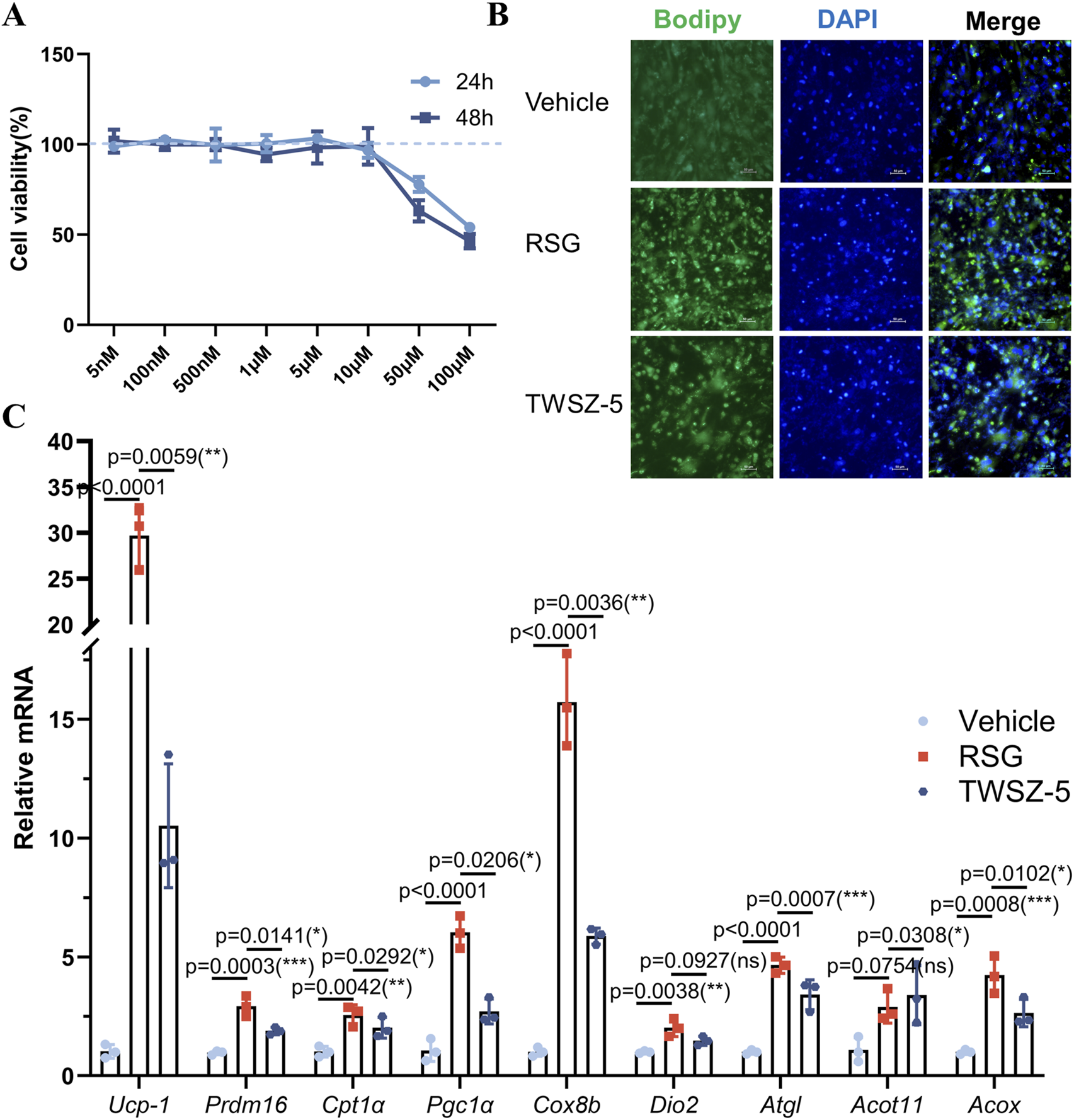 Figure 5. TWSZ-5 effectively promoted the beige adipocyte differentiation in vitro. (A) The cytotoxicity of TWSZ-5 on ADSCs. (B) BODIPY staining of the content of lipid droplets. (C) Beige cell-related marker gene expressions were evaluated by qPCR.