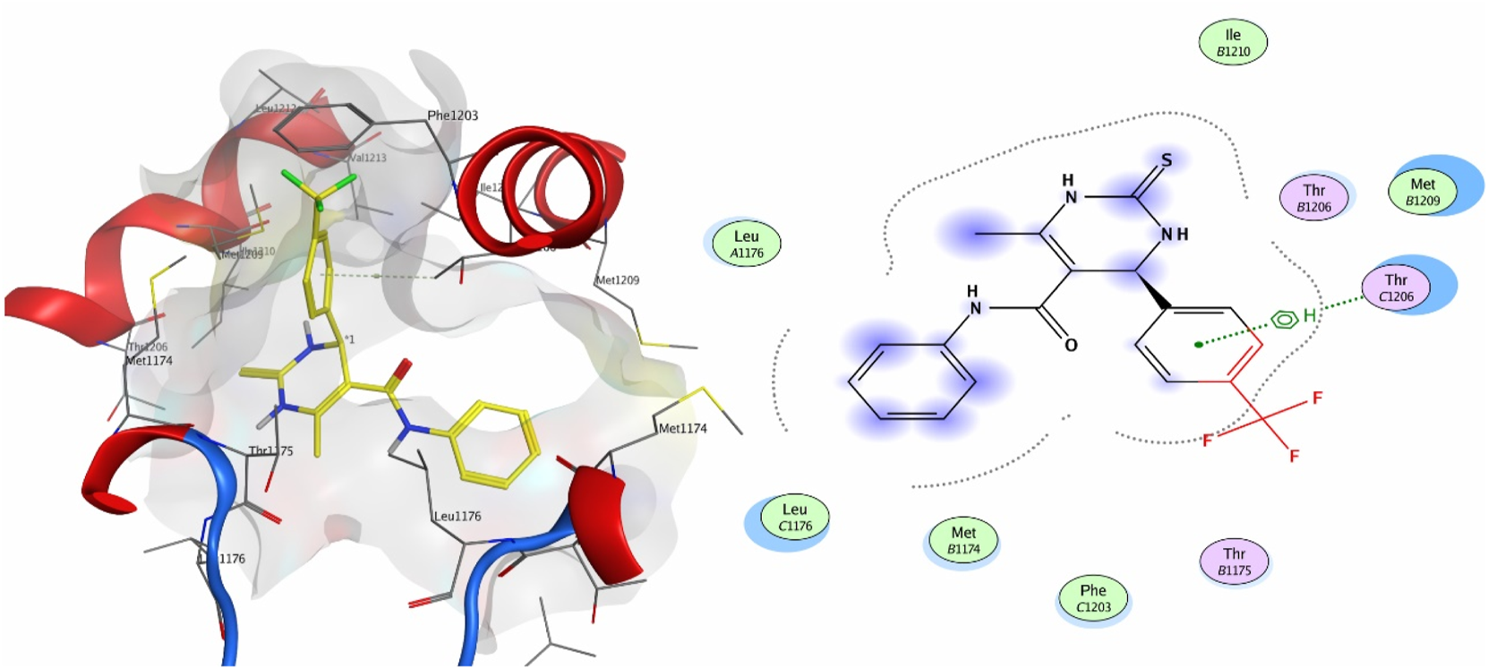 When tested against the target protein 4MS2, compound 4a exhibits H-acceptor interactions with the Thr1206 residue of the target receptor with a docking score of −3.6 and bond distance of 3.35 Å (Figure 3).