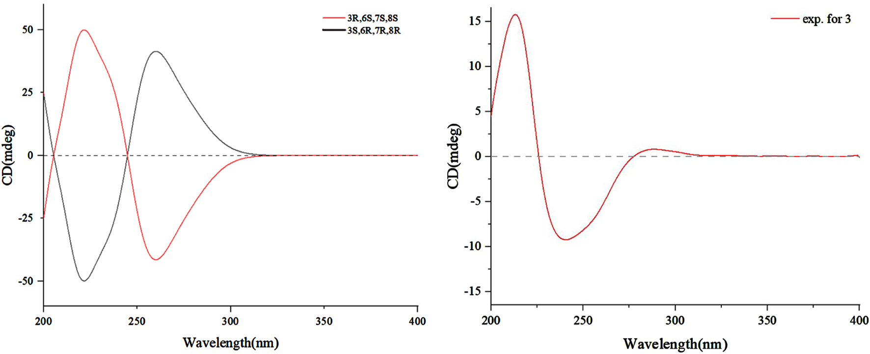 Despite coherence, key questions remain: the timing of O-methylation, enzymatic versus abiotic dimerization triggers and ecological drivers of dimer selectivity. Resolving these requires gene cluster analysis and isotopic labeling studies. Overall, the pathway exemplifies fungal innovation in merging polyketide logic with radical-mediated cycloadditions, underscoring desert endophytes as reservoirs of structurally unique metabolites shaped by environmental pressures. To further support this hypothesis, modified Mosher’s reactions were tried but were not successful. Thus, the absolute configuration of 3 was determined by the comparison of the ECD spectrum recorded in MeOH and the DT-DFT-calculated spectrum of 3 at the B3LYP16-311+G (d, p) level. The calculated ECD spectrum of 3 matched with the experimental ECD spectrum (Figure 5), which suggested its stereochemistry to be 3R, 6S, 7R, and 8S.