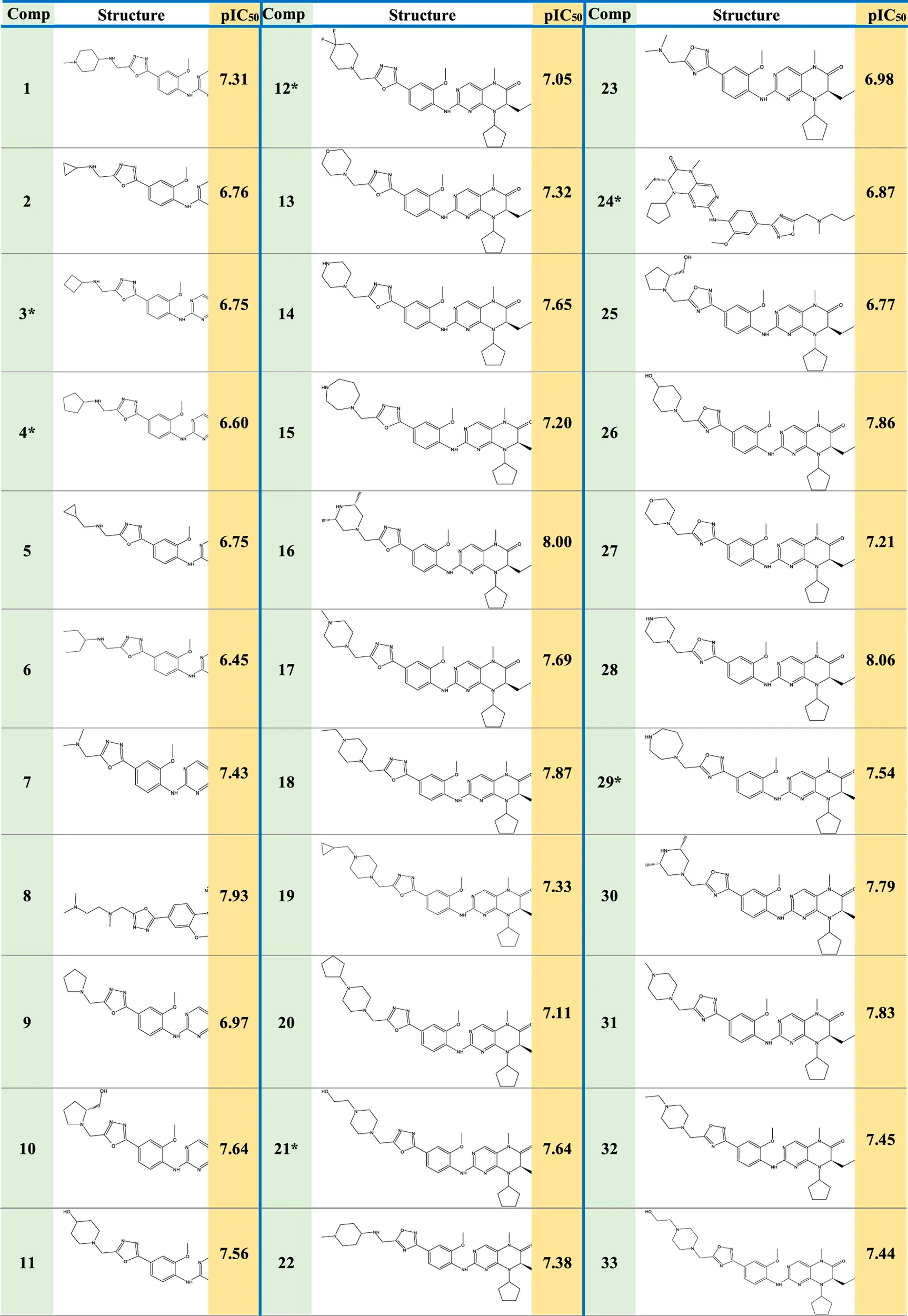 Based on experimental data on the inhibitory activities of 33 previously synthesized dihydropteridone-derived molecules containing an oxadiazole moiety against MCF-7 cells, we conducted molecular modeling studies (Li et al., 2023). To standardize and simplify the analysis, the observed activity values (IC50) were transformed into pIC50 values, using a logarithmic scale of log (IC50), the values of which are shown in Table 1.