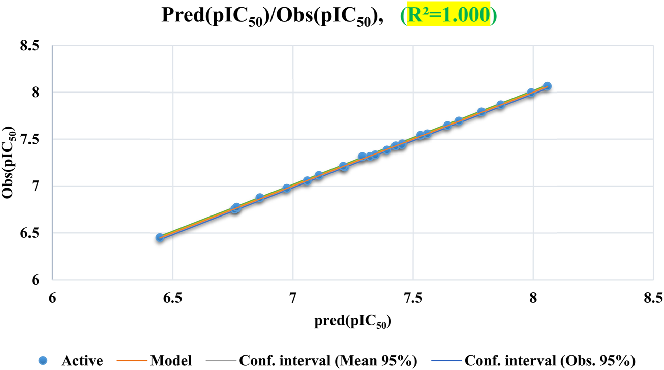 As shown in Equation 5, MCF-7 inhibitory biological activity (pIC50) values correlate linearly with the five selected descriptors. The following parameters are used to evaluate the QSAR model developed using the MLR technique: R2, F, MSE, P-value and