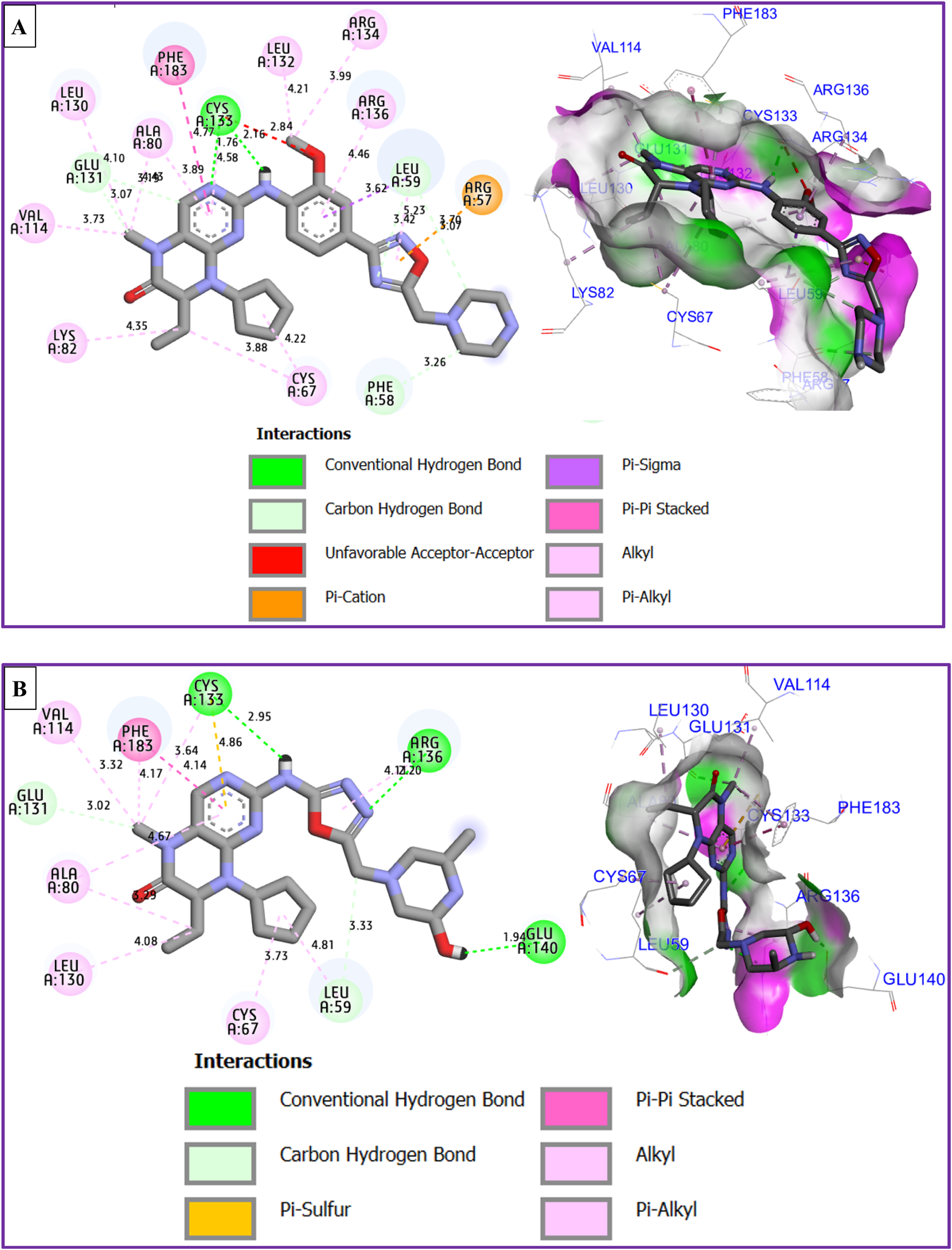 In the present work, a molecular docking process was carried out with the assistance of Autodock 4.2 and Discovery Studio 2021 programs, in which the most active compound (C28) and the candidate ligand (M5) were chosen to be docked towards the structure of PLK1 in complex with BI2536 (PDB ID of 2RKU) as a targeted receptor responsible to the cytotoxic inhibitory activity against breast cancer cells (MCF-7). In the first stage, the targeted protein was prepared by adding the charges of Gasteiger, removing Water (H2O) molecules and all suspended ligands (El fadili et al., 2023a; Ed-Dahmani et al., 2024; Nouioura et al., 2024a). Then, C28 and M5 were docked the prepared protein using Autodock4.2 software (El fadili et al., 2023c; Nouioura et al., 2024b). In the second stage, Discovery Studio 2021 software was employed to visualize the produced contacts in two and three dimensions (El fadili et al., 2023b; El fadili et al., 2024).