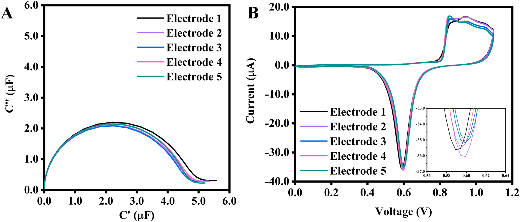 (A) ECS of 5 SPEs electropolished with the same scan rate and potential range, but with a different number of CV scans to achieve the same Au reduction peak current of −35.0 μA, and their corresponding CVs (B). The inset is a zoomed-in image of the reduction peak. The potential range for the CV is between 0.0 V and 1.1 V at a scan rate of 0.1 V/s. The number of cycles needed to reach −35.0 μA for electrodes No. 1 to 5 are 5, 5, 6, 8, and 10, respectively.