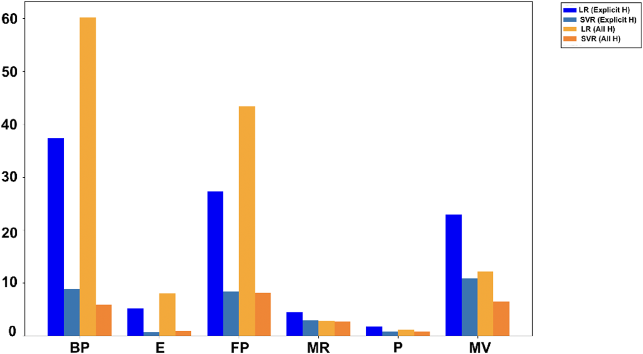 Two molecular configurations were analyzed: one with only explicit hydrogen and the other including all hydrogen atoms. To assess predictive performance, linear regression (LR) and support vector regression (SVR) models were employed.