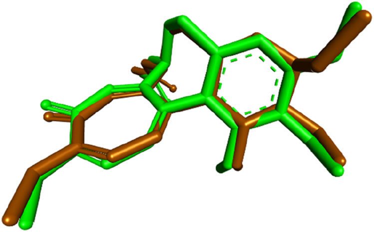 Superimposition of the redocked (brown) and cocrystallized (green) poses of colchicine within the binding site of tubulin.
