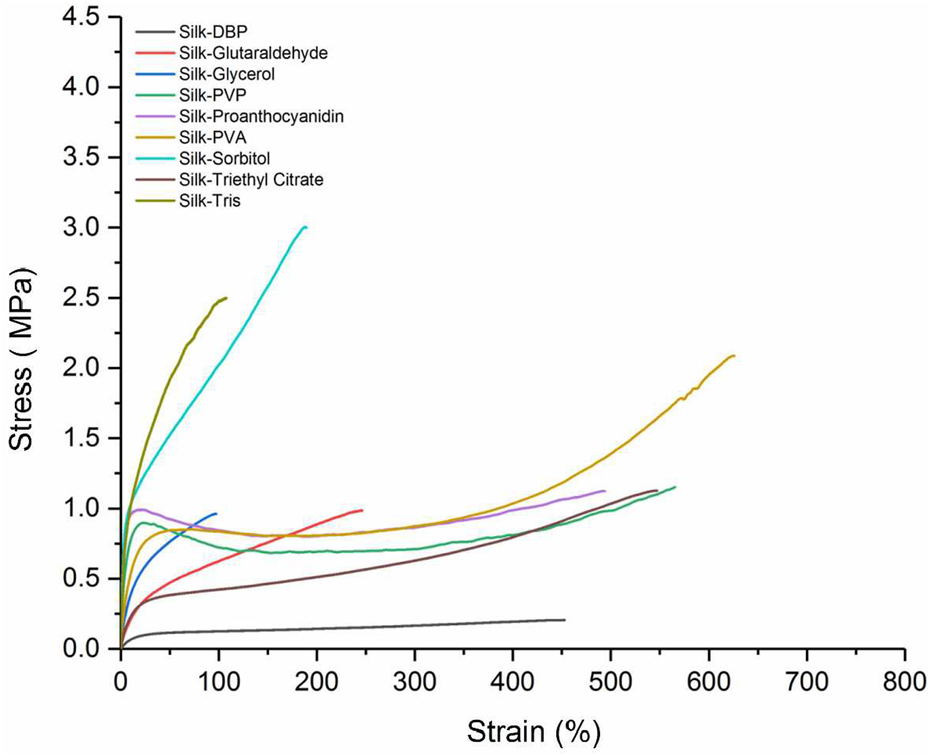 Stress–strain curves of silk–dibutyl phthalate (DBP), silk–glutaraldehyde, silk–glycerol, silk–polyvinylpyrrolidone (PVP), silk–proanthocyanidin, silk–poly(vinyl alcohol) (PVA), silk–sorbitol, silk–triethyl citrate, and silk–tris(hydroxymethyl)aminomethane.