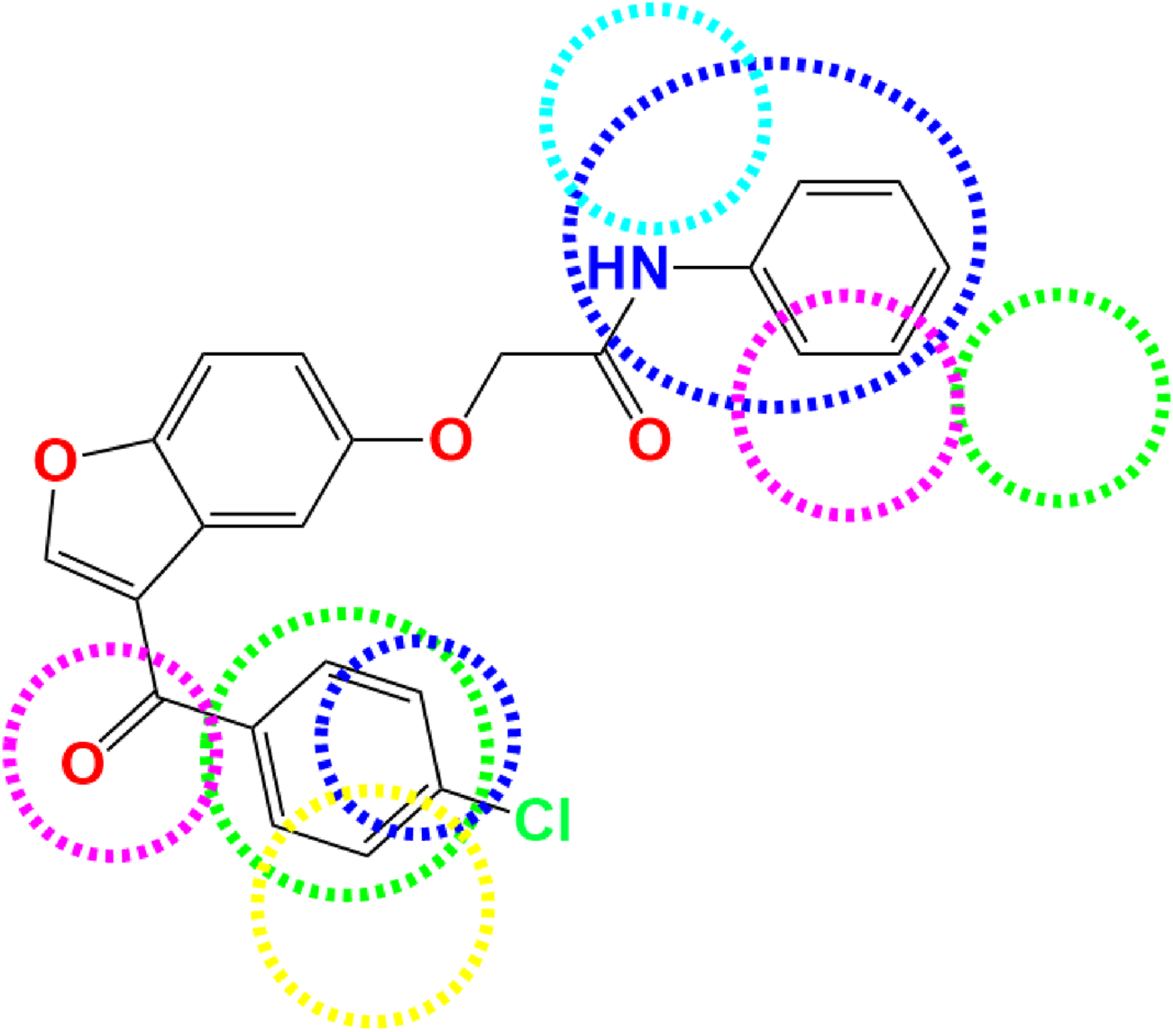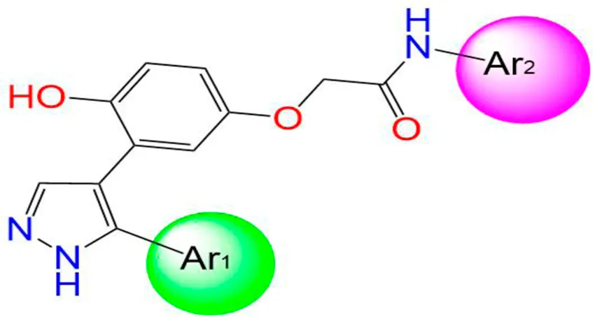 Three-dimensional quantitative relationships between the chemical structures of the new pyrazole- and benzofuran-based derivatives towards anti-acetylcholinesterase activities were established using SYBYL-X 2.0 software, where the partial least square (PLS) method was properly employed to generate the classical CoMFA model and all the possible CoMSIA models responsible for the studied inhibitory activity, after several randomizations performed by dividing the experimental data into two subsets: A training set with 70% of the total data and a test set including 30% of the whole data. The CoMFA model focuses primarily on steric and electrostatic molecular fields, while the CoMSIA models additionally involve hydrophobic, acceptor, and donor of hydrogen bonds’ fields. The optimal 3D-QSAR model was selected for external validation using a test set comprising the five chemical compounds C2*, C10*, C14*, C15*, and C16*. The remaining thirteen molecules were chosen to develop both CoMFA and CoMSIA models. Among them, the compound C7, belonging to the pyrazole family, exhibited the most potent anti-acetylcholinesterase activity. The chemical structures of the active molecules were initially optimized by minimizing their energy (in kcal/mol) to ensure the stability of each geometric conformation. This process involved assigning Gasteiger-Hückel charges and setting the convergence parameter of the Powell-gradient algorithm to 0.001 kcal/(mol·Å), with a maximum of 10,000 iterations. The optimization was carried out using the Tripos force field. Superposition analysis identified 2-phenoxy-N-phenylacetamide as the common core structure aligning both pyrazole- and benzofuran-based derivatives, as illustrated in Figure 1.