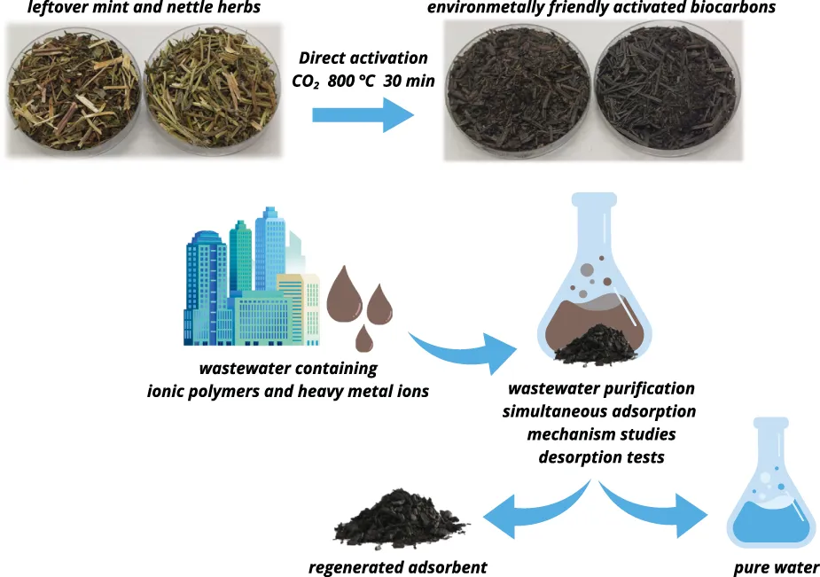 Growing contamination of aquatic systems by industrial and domestic pollutants necessitates the development of efficient and sustainable wastewater treatment technologies. Activated biocarbons derived from renewable biomass sources have proven to be promising materials for this purpose thanks to their large specific surface area, well-developed porosity, high content of surface groups and cost-effectiveness. This paper describes the preparation, physicochemical characterization and practical application of carbonaceous adsorbents derived from the nettle and mint herbs residues using an environmentally friendly method–single-stage (direct) physical activation with carbon dioxide. The obtained activated biocarbons were fully characterized in terms of their texture, surface properties, and chemical composition, and then used to remove ionic polymers (poly(acrylic acid) and polyethyleneimine) as well as Cd(II) and As(V) ions from aqueous solutions. The influence of the above-mentioned substances on their mutual adsorption was investigated. The obtained eco-friendly carbonaceous materials are characterized by moderately developed surface area (368–666 m2/g) and high content of the surface functional groups (2.19–4.89 mmol/g). The maximum adsorbed amounts of ionic polymers reached the level of about 80 mg/g, while those of heavy metal ions varied in the range of 4–19 mg/g. Competitive adsorption between the polymer chains and heavy metal ions was confirmed. In the binary system containing both types of macromolecules, an increase in the adsorbed amounts of poly(acrylic acid) and polyethyleneimine was observed. In turn, the simultaneous presence of ionic polymers and heavy metal ions leads to a reduction in the adsorbed quantities of all adsorbates. The analysis of adsorption-desorption, surface, and electrokinetic data allowed the identification of the most probable mechanisms of separation of ionic polymers and heavy metal ions from the aqueous phase using eco-friendly carbonaceous adsorbents.