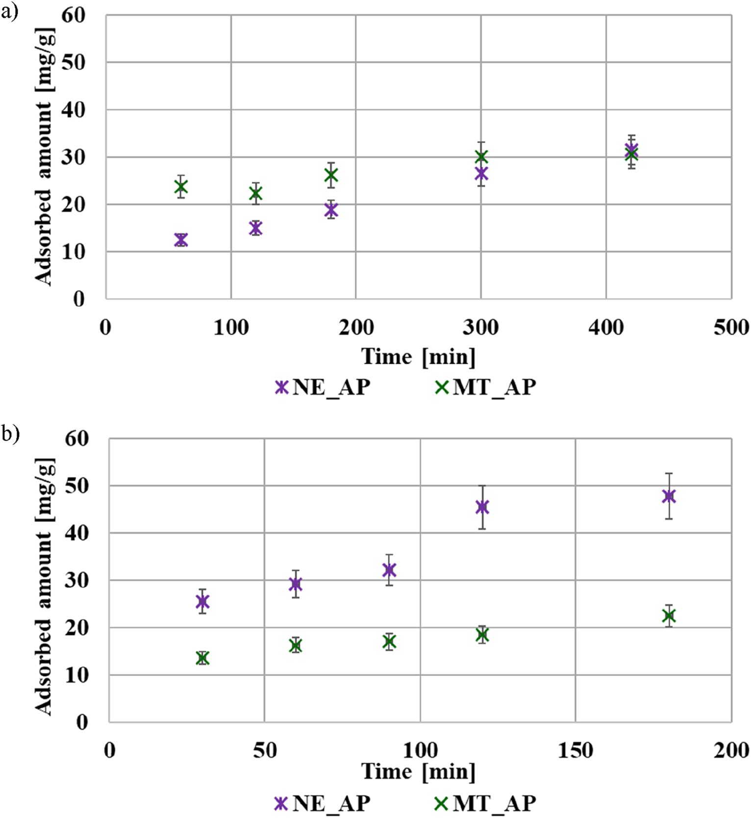 Both obtained activated biocarbons have a mesoporous structure and well-developed specific surface area (Table 1). The material obtained from the mint herb residue shows significantly better textural parameters (surface area 666 m2/g), while the adsorbent derived from the nettle herb remains is characterized by a greater concentration of the functional groups on its surface (Table 2). Both of these parameters have a strong impact on the activated biocarbons adsorption capacity. The average pore size of both adsorbents is approximately 2 nm, which allows to classify these materials as mesoporous. The surface of examined solids is dominated by basic functional groups, the concentration of which for NE_AP material is about 14 times higher than acid groups. The points of zero charge (pzc) occur at pH 8.5 and 9.7 for nettle- and mint-based samples, respectively, which confirmed the alkaline properties of both adsorbents. On the other hand, the isoelectric points (iep) of activated biocarbons (iep) are located at pH below 3 for NE-AP activated biocarbon and at pH 3.5 for MT_AP one, which are significantly lower than the pzc values. It may be the result of partial overlapping of the electrical double layers (edl) formed on the walls of the pores, which is a phenomenon often observed for mesoporous materials (Skwarek et al., 2014; Szewczuk-Karpisz et al., 2021).