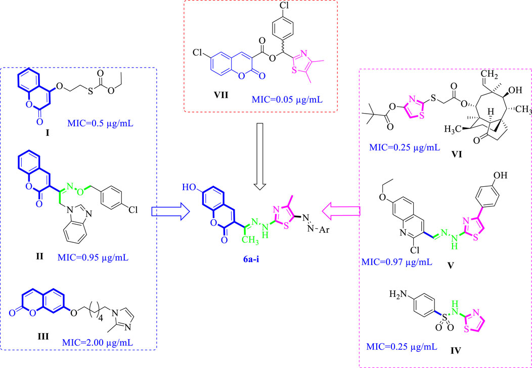 Figure 1. Reported antibacterial agents containing bioactive cores coumarin I-III, thiazole IV-VI, Coumarin-thiazole VII and our newly target compounds 6a-i.