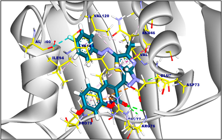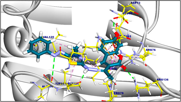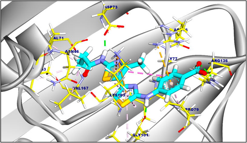 The suggested binding mode of compound 6a demonstrated a binding energy of −8.35 kcal/mol in relation to DNA Gyrase B (PDB ID: 4duh). A total of fifteen interactions were identified, including hydrophobic π-π, π-cation, π-anion, π-alkyl, and π-sigma interactions with Val120, Ile94, Lys103, Ile78, Gly77, Glu50, Pro50, and Arg76 amino acids sidechain. Moreover, compound 6a formed five hydrogen bonds with Ala100, Gly101, Asp73, Thr165, and Arg136 with a distance of 3.29, 1.76, 1.82, 2.37, and 2.42 Å, Figure 2. The binding mode of compound 6c showed a binding energy that was not constrained (∆G) equal of −7.14 kcal/mol. fourteen hydrophobic π-π, π-anion, π-cation, and π-alkyl interactions were conducted with Pro79, Arg76, Glu50, Lys103, Ile94, Val120, Val43, Val167, Ile78, and Asn46. Additionally, the interaction of Compound 6c was stabilized by the formation of three hydrogen bonds with Arg76, Gly77, and Asp73 with distances of 2.59, 2.50, and 2.05 Å (Figure 3). Furthermore, The co-crystalized ligand complexed with DNA Gyrase B exhibited an affinity score of −8.12 kcal/mol with RMSD value equal 1.12 Å, the co-crystalized ligand formed twelve hydrophobic π-alkyl, π-cation, and π-π interactions with Val167, Val43, Val71, Asn46, Gly77, Ile78, Lys103, Ile94, Pro79, and Arg76, additionally, the interaction was supported by three hydrogen bonds with Asp73, Arg136, and Gly101 with distances of 1.87, 2.19 and 1.81 Å (Figure 4).
