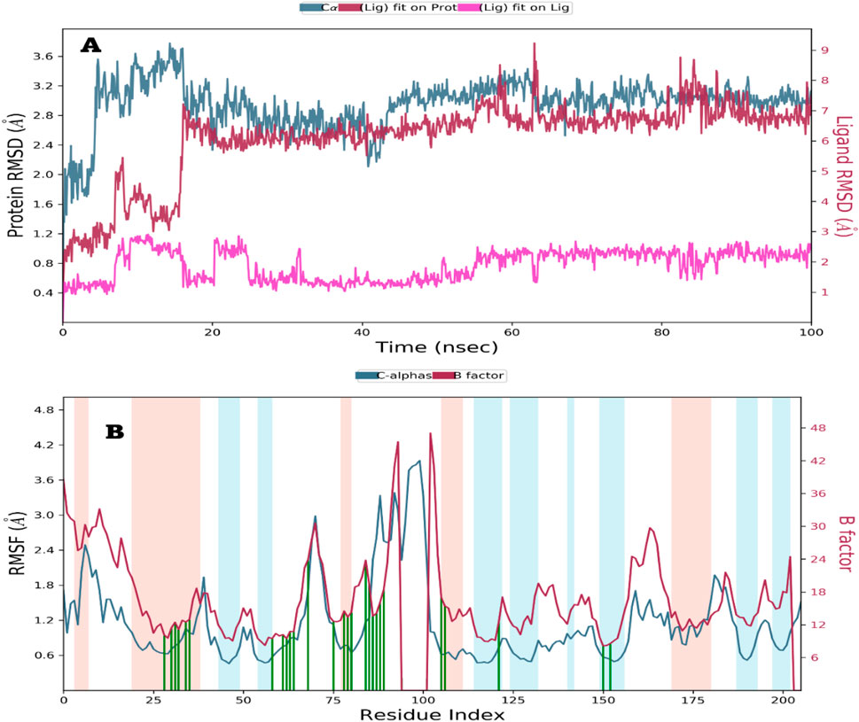 The interactions and behavior of ligands and proteins were analyzed using the Simulation Interaction Diagram tool available in the Desmond molecular dynamics (MD) package. The stability of the MD simulations was evaluated by tracking the root mean square deviation (RMSD) of the positions of ligand and protein atoms over time (Case et al., 2008).