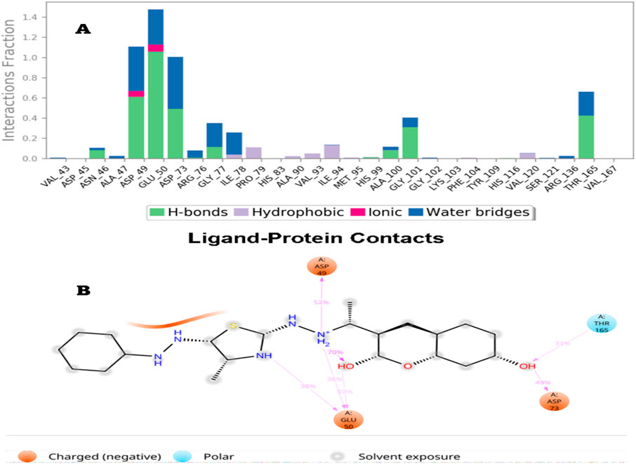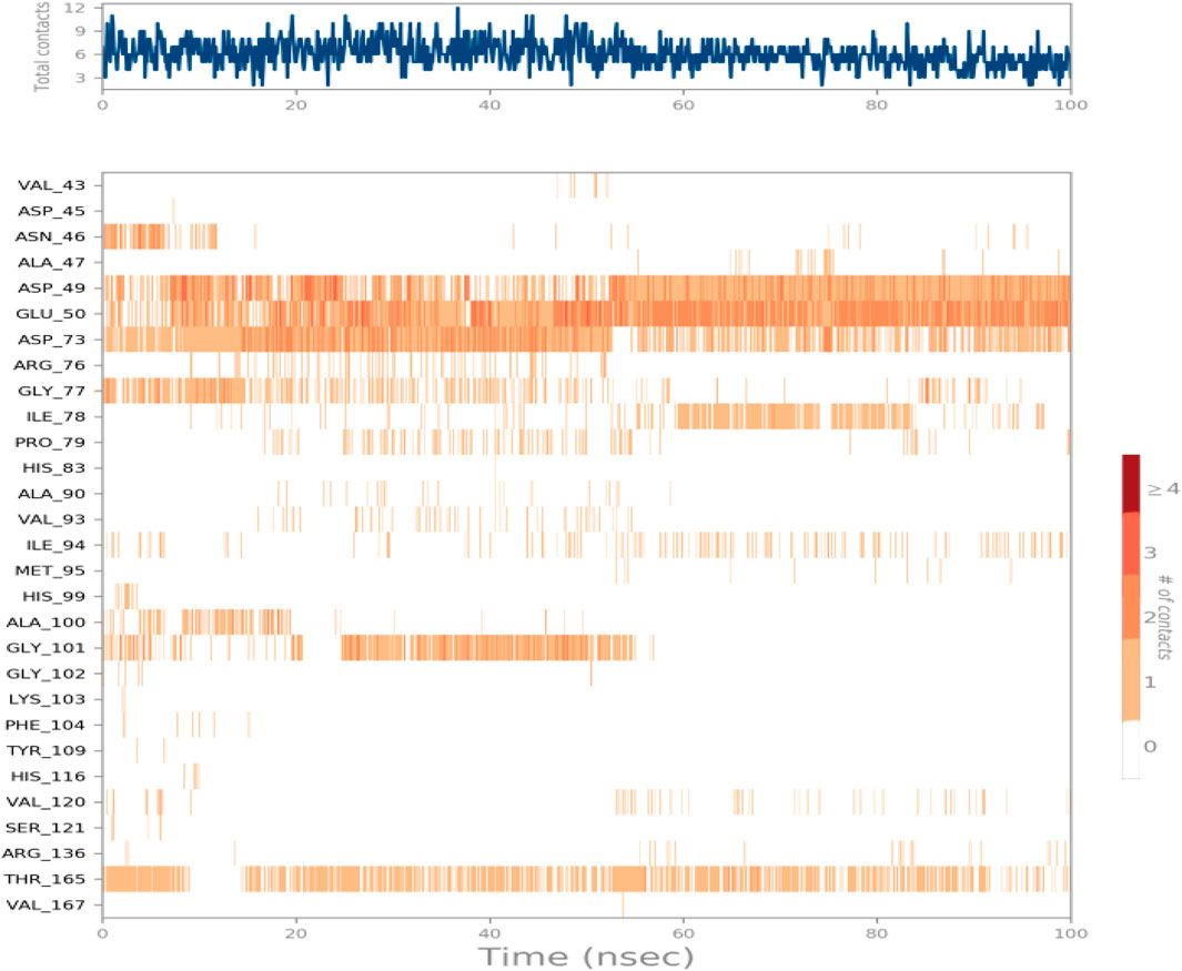 Another method used to monitor these interactions involves plotting the number of interactions concerning time, a heat map Figure 7 indicates the number of interactions at each frame of Compound 6a with DNA Gyrase B, whereas the dark color indicates more interactions. From the heat maps figures, it was observed that the highest number of conformations of the protein of DNA Gyrase B formed up to nine interactions, the most interacted amino acids of DNA Gyrase B with ligand 6a are Asp49, Glu50, Asp73, Gly77, Ile78, Ile94, Gly101 and Thr165.