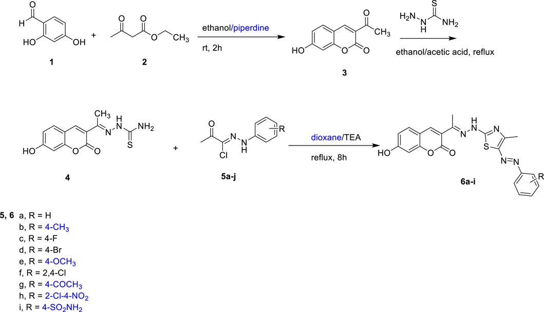 The synthesis of coumarin derivatives 6a-i was executed in accordance with the methodologies delineated in Scheme 1, which also illustrates the formation of the precursor compound, 3-acetyl-7-hydroxy-2H-chromen-2-one (3). In this investigation, a Knoevenagel condensation reaction was employed, wherein 2,4-dihydroxybenzaldehyde (1) was reacted with ethyl acetoacetate (2) at ambient temperature, facilitated by a minimal quantity of piperidine in ethanol, yielding 3-acetyl-7-hydroxy-2H-chromen-2-one (3) (Hassan et al., 2023). Subsequently, this compound underwent reflux with thiosemicarbazide in absolute ethanol, with the addition of several drops of glacial acetic acid, resulting in the formation of the corresponding thiosemicarbazone 4. The heterocyclization of thiosemicarbazone derivative 4, an important intermediate, was successfully accomplished by refluxing it with a range of hydrazonoyl chloride derivatives 5a-I. These derivatives were synthesized using established methods that involve the reaction of diazonium chloride with appropriately activated halogenated methylene groups, which is an efficient approach for generating various hydrazonoyl halides (Osman et al., 2023). The reaction was conducted in dioxane, with the addition of a few drops of triethylamine (TEA), resulting in the formation of the desired compounds, 6a-i. The structural characterization of the newly synthesized derivatives was performed utilizing 1H-NMR and 13C-NMR spectroscopy, as detailed in the Experimental section.