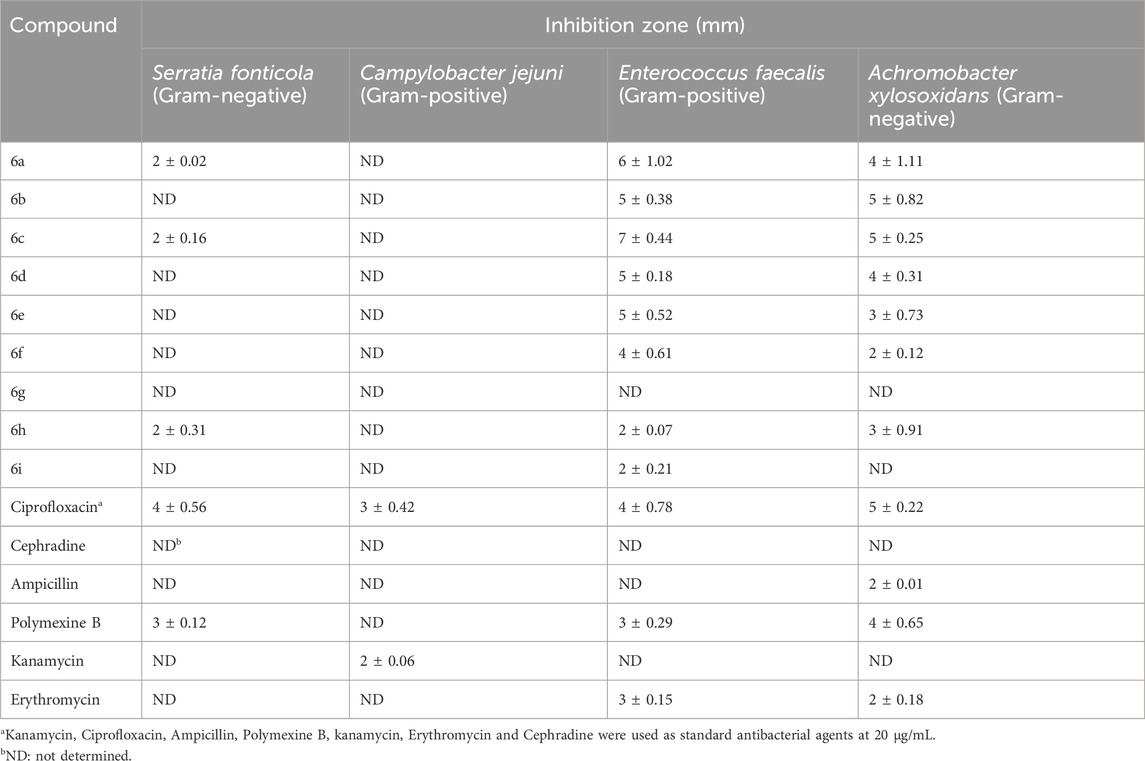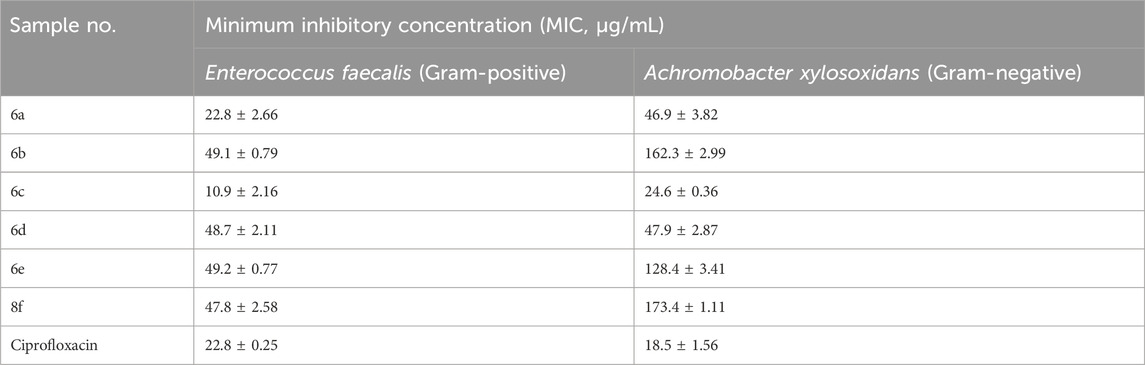 The target compounds 6a-i were prepared, and their antibacterial activities were investigated against XDR and MDR pathogens. As can be seen in Supplementary Figure S1, the sensitivity of the XDR pathogens (C. jejuni and S. fonticola) towards the tested compounds was found to be negligible, as no inhibition zone appeared around all tested molecules. High resistance demonstrated by these pathogens emphasized the ineffective action of the tested compounds; hence, those were excluded from our examination. Interestingly, the efficiency of the targeted compounds was notably performed toward the MDR pathogens (A. xylosoxidans) and XDR (E. faecalis) (Table 1). A significant activity was clearly indicated in the case of most tested compounds against both pathogens except for compound 6g. On the other hand, the activity of some tested compounds was relatively preferred when compared to the standard antibacterial agents. Since some compounds of this group obtained an inhibition zone higher than that carried out by the potent antibacterial standards. Surprisingly, compounds 6a-e had higher sensitivity towards E. faecalis than that obtained by ciprofloxacin (4 mm). In addition, the ability of these compounds to inhibit A. xylosoxidans was observed in the equal efficacy of the reference drug (5 mm) as occurred in compounds 6b and 6c. Our results clearly showed that compounds 6a-f and h were very effective against A. xylosoxidans and E. faecalis. Therefore, further studies using potent compounds were implemented against A. xylosoxidans and E. faecalis to establish more details about their activity.