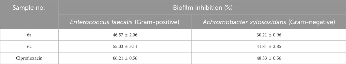Quantitative assay methodologies were utilized to assess the effectiveness of the potent compounds 6a and 6c in inhibiting biofilm formation by specific bacterial pathogens. Initially, the assessment of microbial biofilm formation was conducted at a fixed concentration of 50 μg/mL. The target compound 6c demonstrated greater effectiveness against both bacterial pathogens, as shown in Table 3. Both compounds yielded significant results regarding the inability of bacterial pathogens to produce biofilm while maintaining cell proliferation without negative consequences. The assessment of biofilm formation demonstrated a significantly enhanced ability to suppress biofilm formation in both Gram-positive and Gram-negative bacteria compared to the standard drug. The percentage of bacterial biofilm inhibition exceeded 50% for E. faecalis, indicating that it is a promising antibiofilm agent. Conversely, it is noteworthy that 6a exhibited moderate antibiofilm efficacy against A. xylosoxidans, with inhibition levels below 40%. The observed differences in biofilm production among the tested pathogens in the presence of these potent molecules may be attributed to variations in the composition of the embedded biofilm.