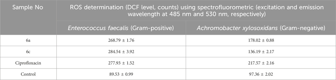 The generation of intracellular oxidative stress, characterized by the presence of reactive oxygen species (ROS), has been identified as a significant factor influencing the antibacterial effectiveness of various antibiotics (Sui et al., 2021). To determine whether compounds 6a and 6c cause membrane damage that results in oxidative stress, the levels of intracellular ROS were measured using a fluorometric assay employing DCFH-DA dye. The findings revealed that the treatment of Enterococcus faecalis and Achromobacter xylosoxidans with compounds 6a and 6c resulted in a notable increase in intracellular ROS production, as demonstrated in Table 4. The results displayed that the highest levels of DCF detected in E. faecalis demonstrated a substantial induction of ROS by compound 6c, followed closely by compound 6a. Importantly, the ROS release was found to exceed that induced by ciprofloxacin, indicating a pronounced oxidative stress response triggered by these compounds in E. faecalis. Conversely, the intracellular ROS levels in A xylosoxidans were significantly lower in comparison to the reference drug. Additionally, an increase in ROS was particularly noted in the context of Gram-positive bacteria.