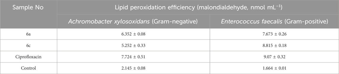 As shown in Table 5, The oxidation potential associated with the bacterial cell membrane by the potent molecules 6a and 6c dramatically increased against both pathogens, particularly in the case of E. faecalis. A notable difference in LPO activity was observed among the most active compounds; the lipid oxidation level in Gram-positive E. faecalis was remarkably close to that observed with the standard antibiotic. However, the effect of the targeted compounds on the fatty acid content of Gram-negative A. xylosoxidans was found to be lower than that caused by the standard antibiotic, except for compound 6a, suggesting their efficacy against Gram-positive bacteria. Furthermore, the cell membrane structure of each bacterial type reflects the performance of the potent compounds. Notably, the ability of both compounds to induce significant oxidation of lipid content in E. faecalis was greater than in A. xylosoxidans, attributed to differences in cell membrane composition. The variations in cell membrane composition were discussed, which may be due to the presence of a lipopolysaccharide layer surrounding the Gram-negative outer membrane.