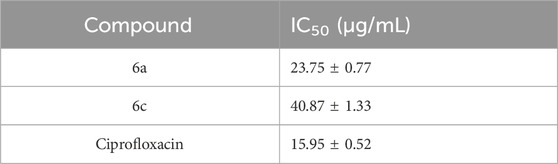 An assay to evaluate the inhibition of E. coli DNA gyrase was conducted for the two most potent compounds, 6a and 6c, with Ciprofloxacin serving as a reference control. The findings are presented in Table 6, indicating the IC50 values in μg/mL. Compound 6a exhibited notable inhibitory activity against DNA gyrase, with an IC50 value of 23.75 μg/mL, relative to the Ciprofloxacin control, which recorded an IC50 of 15.95 μg/mL. Conversely, compound 6c demonstrated a comparatively lower level of inhibition, being approximately 2.5 times less effective than the control.