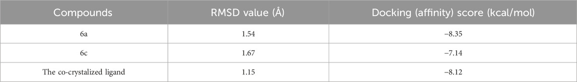 The in vitro assessment of enzyme inhibition for the most active derivative 6a and 6c was performed against E. coli DNA gyrase B. The anticipated assay was done using E. coli DNA gyrase microplate assay kit (Inspiralis) according to the optimized protocol of the manufacturer. Ciprofloxacin was used as a reference drug for E. coli DNA gyrase B according to the previously reported methods (Fayed et al., 2022). The obtained data are tabulated as IC50 values in Table 6.