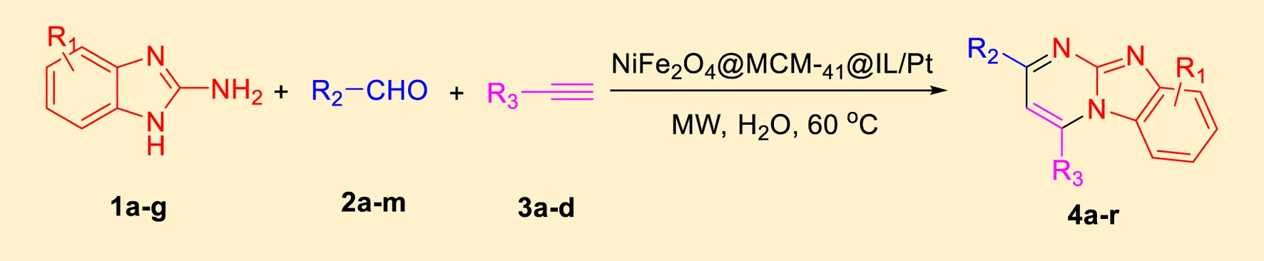In summary, developing the NiFe2O4@MCM-41@IL/Pt (II) complex nanomagnetic catalyst significantly advances sustainable organic synthesis. By leveraging the advantages of microwave-assisted synthesis, nanocatalysis, and the unique properties of ionic liquids, this work offers a robust and efficient method for synthesizing fused imidazo[1,2-a]pyrimidines. The implications of this research extend beyond immediate synthetic applications, potentially influencing a broader range of catalytic processes and initiatives aimed at environmental sustainability in organic chemistry.