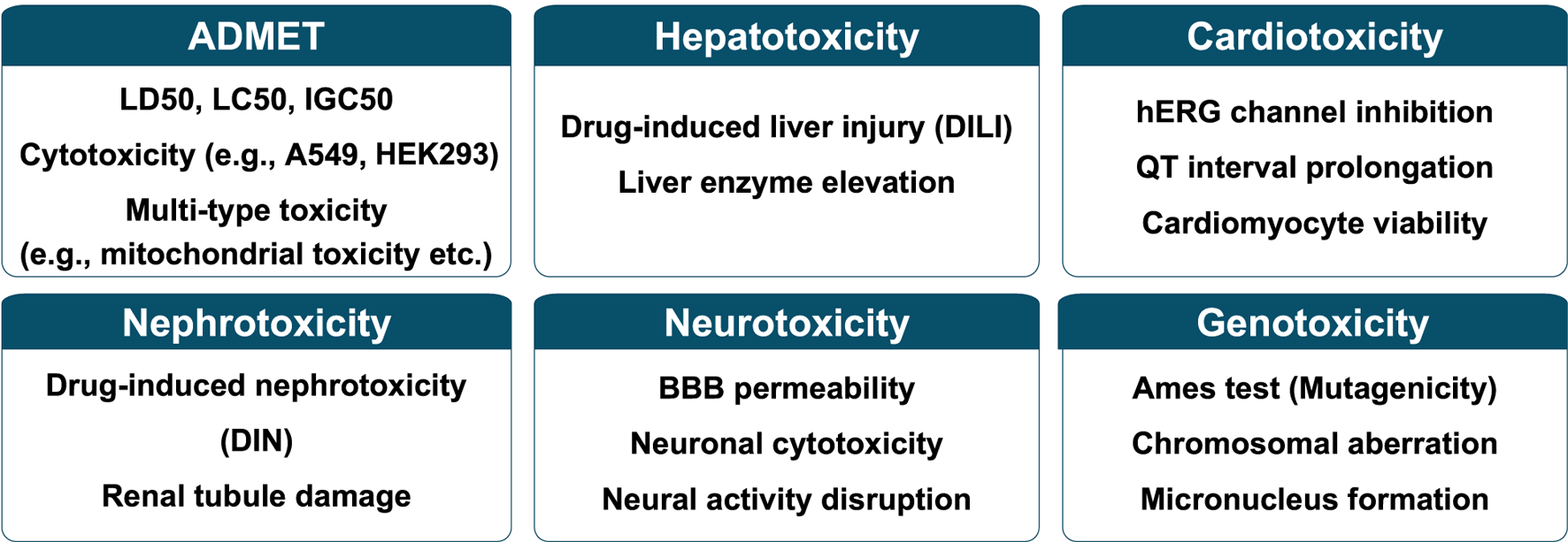 Several publicly accessible ADMET prediction tools, including ADMETLab 3.0, Deep-PK, ProTox 3.0, Helix-ADMET, FP-ADMET, and admetSAR 2.0 (Yang et al., 2019; Venkatraman, 2021; Zhang et al., 2022; Banerjee et al., 2024; Fu et al., 2024; Myung et al., 2024), provide a wide array of toxicity prediction models, each differing in scope, algorithmic strategy, and coverage. ADMETLab 3.0 offers predictive models for 119 endpoints, including toxicity-related properties such as hERG inhibition, carcinogenicity, and respiratory toxicity. These models are built using directed message-passing neural networks (DMPNNs) and incorporate uncertainty estimation features. The toxicity models, such as the one for hERG inhibition, have demonstrated strong performance with AUROC values approaching 0.94. In terms of interpretability, ADMETLab 3.0 provides uncertainty scores alongside predictions, uses colored indicators to represent empirical decision states, and highlights structural alerts contributing to toxicity (Fu et al., 2024). Deep-PK is a deep learning–based framework that predicts 73 endpoints, including 35 toxicity-related endpoints, 29 other ADMET properties, and 9 general molecular descriptors. While its primary focus lies in pharmacokinetic regression tasks and ADMET optimization, it offers comprehensive support for toxicity assessment through GNN-based pipelines that accept SMILES, SDF, and molecular descriptor inputs. The model also provides interpretability by identifying key molecular subgraphs that contribute to prediction outcomes (Myung et al., 2024). ProTox 3.0 is particularly comprehensive in its treatment of toxicity, providing 61 predictive models covering a broad spectrum of endpoints. These include organ-specific toxicities such as hepatotoxicity, neurotoxicity, cardiotoxicity, and nephrotoxicity, along with models for clinical, immunological, and nutritional toxicities. The platform integrates mechanistic insights through AOPs, molecular initiating events, and target-specific toxicities, and supports ontology-driven, systems-level interpretation (Banerjee et al., 2024). Helix-ADMET is a flexible ADMET prediction platform that combines self-supervised and multi-task learning to enhance generalizability across diverse chemical scaffolds. It supports fine-tuning on user-defined endpoints and classifies toxicity into macro- and micro-level categories (Zhang et al., 2022). FP-ADMET is an open-source tool that focuses on over 50 ADMET-related endpoints, including drug-induced liver injury, hERG inhibition, hemolytic toxicity, mitochondrial toxicity, and cell-specific cytotoxicity. The models are constructed using random forest classifiers trained on 20 different types of chemical fingerprints, enabling broad chemical space coverage and compound exploration (Venkatraman, 2021). admetSAR 2.0 provides 47 curated endpoints, including Ames mutagenicity, carcinogenicity, immunotoxicity, and hERG inhibition. It employs traditional machine learning algorithms such as random forest, SVM, and k-nearest neighbors (KNNs) applied to molecular descriptors and fingerprints (Yang et al., 2019).