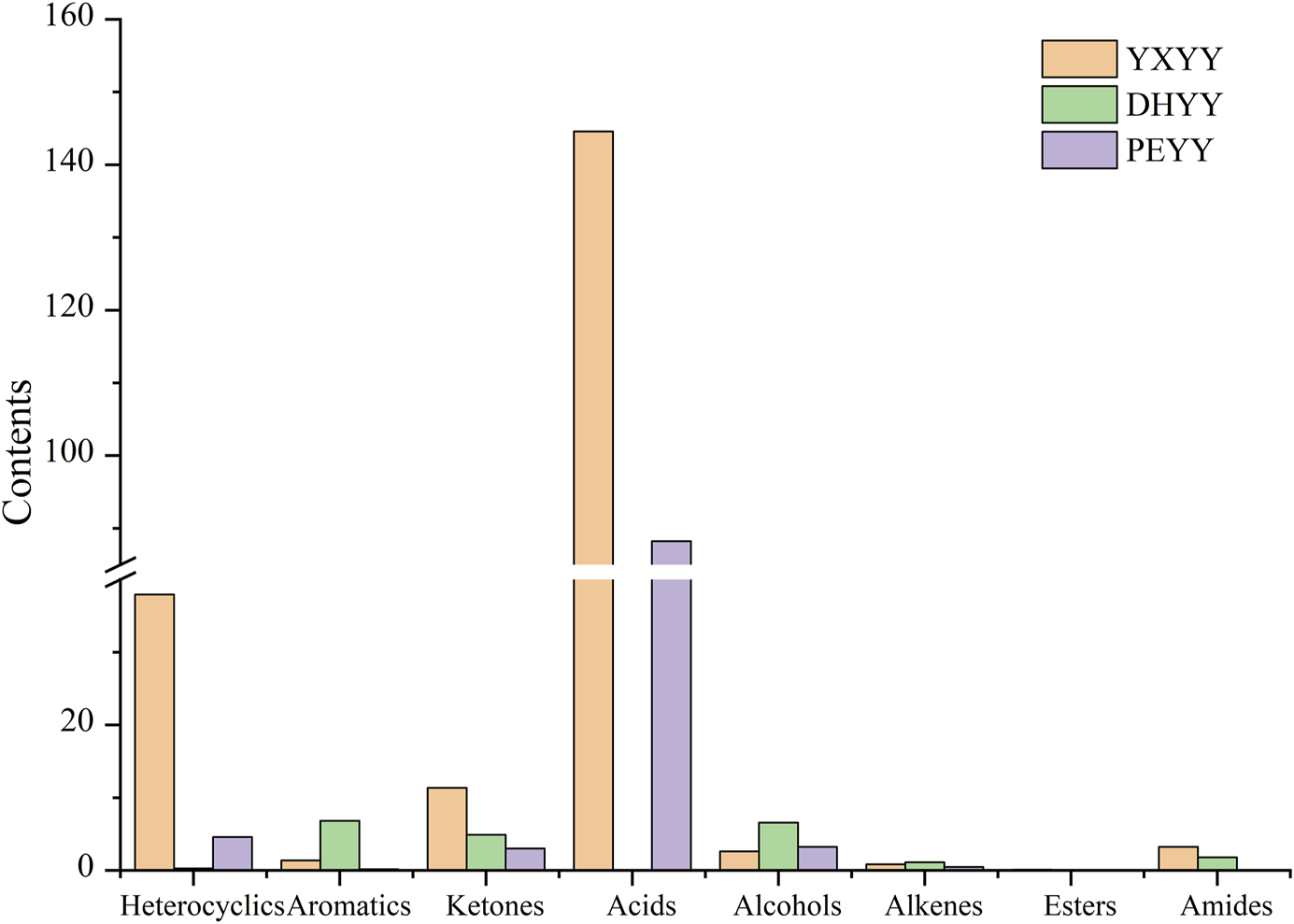 In this study, the SAFE method was used to extract the volatiles from the three types of cigar leaves shown in Figure 2. A total of 110 volatile compounds were detected, including 14 amides, 12 aromatic compounds, 8 acids, 4 olefins, 12 alcohols, 1 aldehyde, 18 ketones, 6 esters, 31 heterocyclic compounds, and 4 others, which were in 10 major groups. Among these volatile compounds, there were 92 volatile compounds in YXYY, 60 in DHYY and 68 in PEYY (Table 1). The number of volatile compounds in cigar filler tobacco was significantly higher than that in wrapper tobacco. This phenomenon may be attributed to the thicker and more compact cellular structure of cigarillo wrapper tobacco, which possesses the capacity to retain a greater quantity of oils and volatile compounds. The structural characteristics of the wrapper leaf, namely its thin structure, flexibility and uniform oil content, serve to limit the accumulation of aroma substances. This phenomenon may also be attributed to the fact that the primary breeding objective of the wrapper leaf is to enhance aroma intensity and complexity. The aubergine varieties, on the other hand, are more concerned with appearance (e.g., uniformity of color, absence of blemishes) (Huang et al., 2025), which leads to the natural differentiation of the chemical composition of the two varieties.