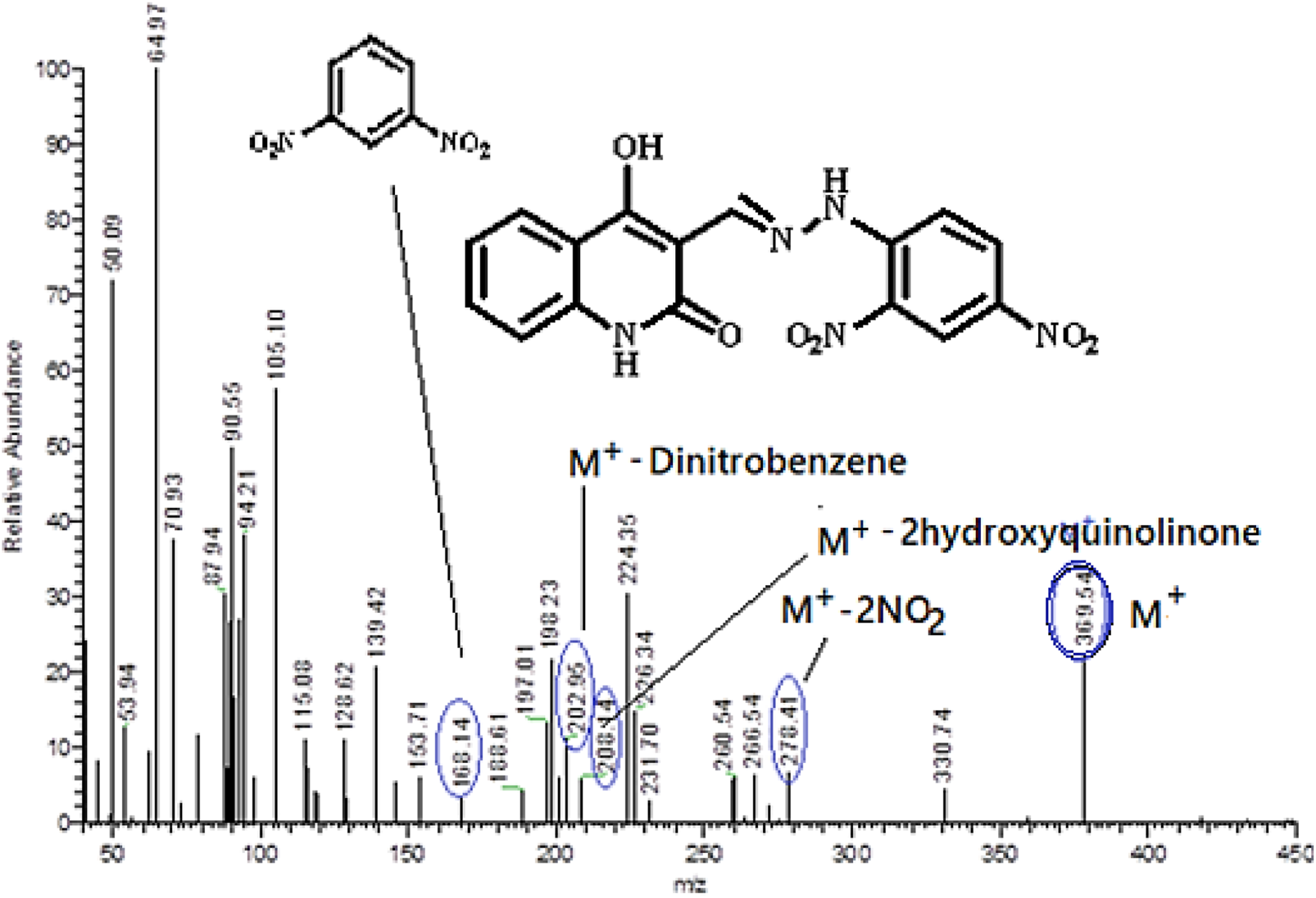 Mass spectrometry and fragmentation patterns for compound (E)-3-((2-(2,4-dinitrophenyl)hydrazono)methyl)-4-hydroxyquinolin-2(1H)-one (5a).