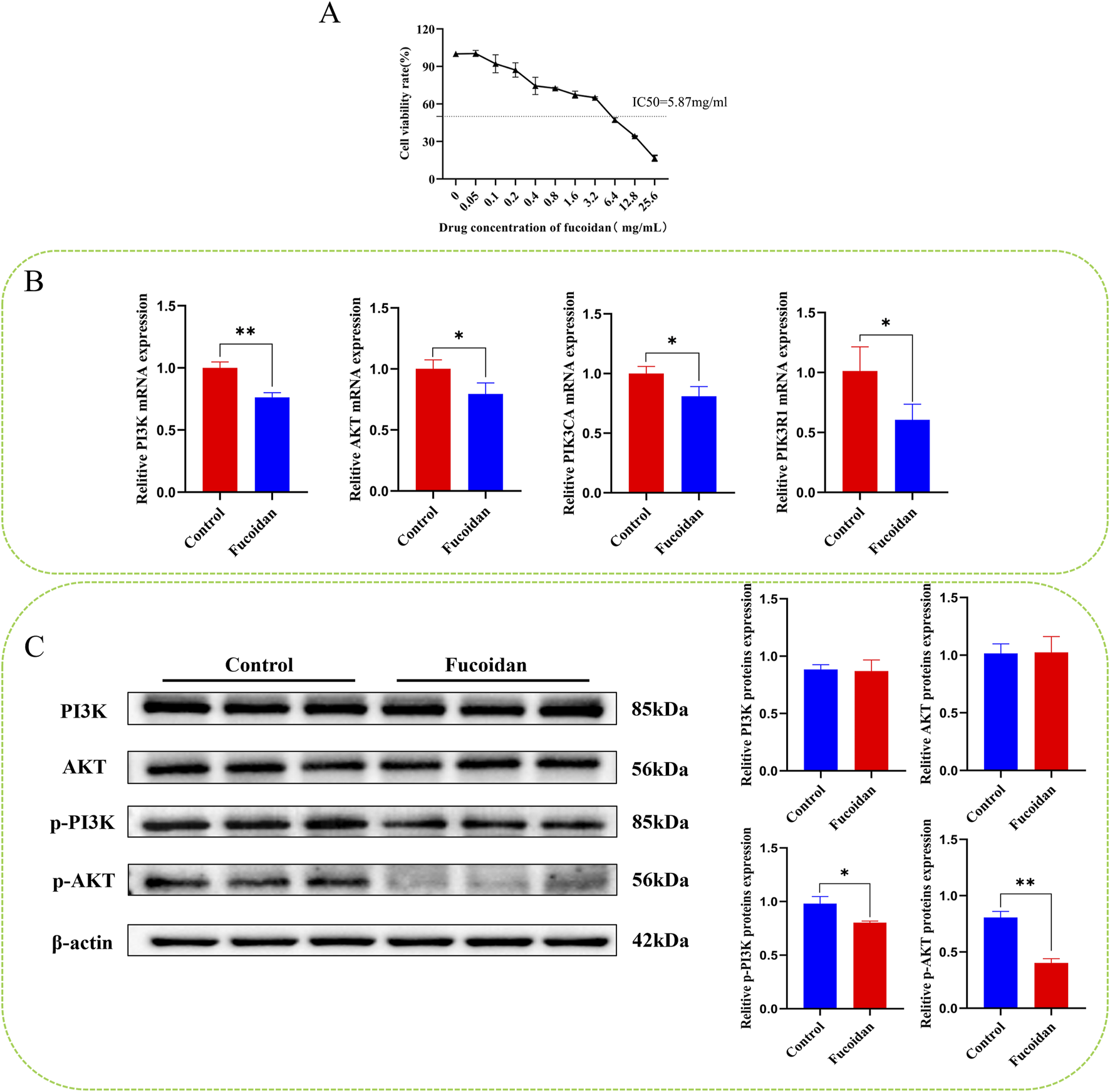 Western blot analysis showed there were no notable differences in the protein levels of PI3K and AKT1 between the group that was treated with fucoidan and the control group. However, the levels of p-PI3K and p-AKT1 were significantly reduced (*p < 0.05, **p < 0.01), as demonstrated in Figure 5C.
