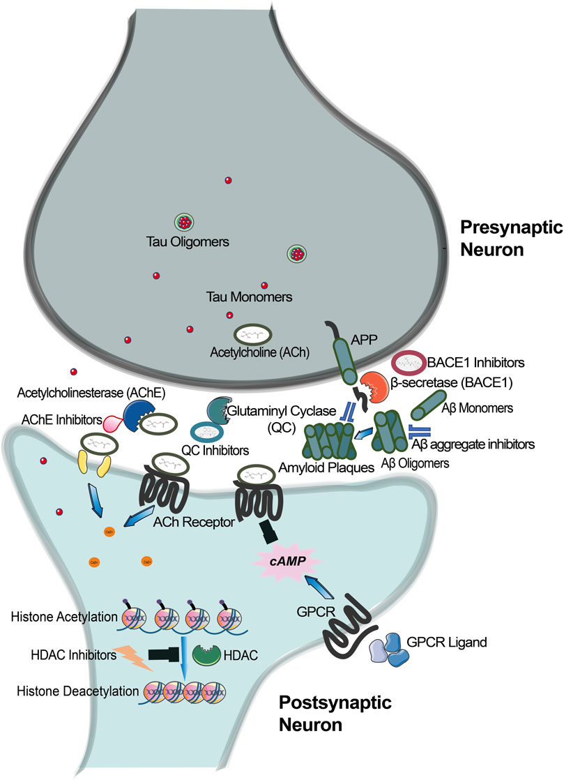 AD is characterized by age-associated gradual loss of memory and cognition (Rosini et al., 2005) and is the leading cause of dementia, which affects more than 55 million people globally. Although preventative factors may include a handful of symptomatic treatment options and frequent social or physical activity, curative therapies are not presently available (Qiu et al., 2009). The neuropathology of AD is multi-faceted, which shrouds the primary causes of the disease; however, contributing genetic conditions have been discovered that are thought to have strong neuropathological determinants (Figure 1). The most apparent condition is the accumulation of Aβ plaques and neurofibrillary tangles, which have both been observed in postmortem studies (Rosini et al., 2005). Aβ plaques are insoluble protein deposits that are formed when amyloid precursor protein (APP) is cut in succession via the action of two enzymes, namely, γ-secretase and β-secretase. The cleaved less-soluble Aβ peptides then aggregate extracellularly, creating Aβ oligomers and plaques in the brain, primarily in the cortex, which interrupt and dampen synapse signalling, often manifesting in the symptom of poor memory. However, neurons are not the only affected cell type as AD can also affect astrocytes and microglia. The interaction of microglia with Aβ can release cytokines that are toxic to neurons and can also initiate phagocytosis (Breijyeh and Karaman, 2020). The other major pathology of AD is the presence of NFTs in neurons. These structures begin to form with an abnormal modification (i.e., hyperphosphorylation) of tau protein. Tau is known to stabilize microtubules in the neurons, but after its hyperphosphorylation, it dissociates, misfolds and relocates to the soma. Misfolded tau proteins have the potential to travel via synapse to neighbouring neurons, spreading further cell damage (Wu et al., 2021). Although curative options for AD are farther from the reach of medicinal chemists, the following few targets provide some hope to treat symptoms of AD and thus prevent further deterioration.
