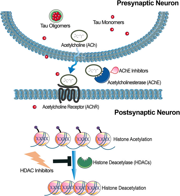 Figure 2. Schematic illustration of targeting either Acetylcholinesterases (AChE) or histone deacetylases (HDAC) as AD therapeutics. Inhibition of AChE would increase synaptic acetylcholine levels, which have been found to be reduced in some cases of AD. HDACs regulate gene transcription and therefore HDAC interference could promote expression of proteins important for learning and memory.