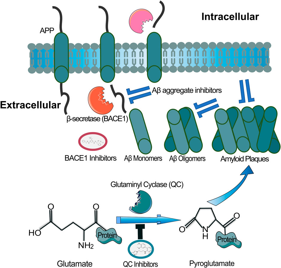 Glutamine cyclase, also known as glutaminyl cyclase (QC), is an enzyme involved in the post-translational modification of certain peptides and proteins (Schilling et al., 2007). QC’s primary function is to catalyze the cyclization of N-terminal glutamine residues to form pyroglutamate (pGlu) (Fischer and Spiess, 1987). This enzymatic reaction is known as pyroglutamate formation or N-terminal cyclization. The process of pyroglutamate formation involves the removal of the free N-terminal glutamine or glutamate residue and subsequent cyclization of the resulting N-terminal glutaminyl or glutamyl residue. QC catalyzes the cyclization reaction by breaking the peptide bond between the N-terminal glutamine and the adjacent amino acid and then forming a cyclic amide bond, resulting in the formation of pyroglutamate (Coimbra et al., 2023). Pyroglutamate formation plays a role in protein stability and activity, which affects downstream functions and signalling of these molecules. Pyroglutamate formation is known to occur in a variety of peptide hormones, neuropeptides, and other bioactive peptides. Notably, the formation of pyroglutamate-modified Aβ peptides (Bsamen et al., 2018; Cynis et al., 2008) has been observed in the brains of individuals with AD (Figure 3). Although such pyroglutamate-modified Aβ peptides represent a small fraction of total Aβ, they are nonetheless thought to be highly toxic due to resistance to aminopeptidase degradation and ability to provide a seed for amyloid fibril formation (Hook et al., 2014; Nussbaum et al., 2012). Moreover, there are also reports of enhanced QC activity in the brains of people with AD (Gunn et al., 2021). Thus, these modified peptides have been suggested to contribute to the neurodegenerative processes and cognitive decline observed in the disease (Camargo et al., 2021; Jawhar et al., 2011; Wittnam et al., 2012). Inhibiting glutamine cyclase activity has been explored as a potential therapeutic strategy for certain diseases (Huang et al., 2011). For instance, in the context of Alzheimer’s disease, inhibiting glutamine cyclase could prevent the formation of pyroglutamate-modified Aβ peptides (Bayer, 2022), which are known to be more aggregation-prone and toxic than their unmodified counterparts. Several small molecules have been developed as glutamine cyclase inhibitors, and research in this area is ongoing (Hoang et al., 2017). Overall, glutamine cyclase is an important enzyme involved in the post-translational modification of peptides and proteins through the formation of pyroglutamate. Understanding its role and regulation may have implications for the development of therapies targeting specific diseases, including neurodegenerative disorders.