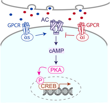 Figure 4. Many GPCRs feed into the cAMP cascade, which regulates kinases and transcription factors that ultimately modulate neuronal activity important for learning and memory. Adjusting cAMP via pharmacology at GPCRs is suggested to improve brain function in AD.