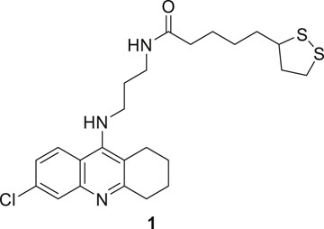 Despite limitations, tacrine is an important scaffold for developing new potent anti-Alzheimer’s agents. Rosini et al. have designed and evaluated a new tacrine and a lipoic acid hybrid called lipocrine. Compound 1 showed good anti-cholinesterase activity. Compound 1 (N-(3-((6-chloro-1,2,3,4-tetrahydroacridin-9-yl)amino)propyl)-5-(1,2-dithiolan-3-yl) pentanamide), a chlorine-substituted tacrine, has three carbon containing chain between lipoic acid. It exhibited low nanomolar inhibitory activity against AChE (IC50 = 0.253 ± 0.016 nM) and BuChE (10.8 ± 2.5 nM) in the Ellman’s assay. Lipocrine is one of the first compounds that inhibit AChE and AChE-induced Aβ aggregation and protects against oxidative radical species (Rosini et al., 2005).