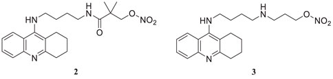 Fang et al. synthesized and evaluated 14 NO-donor-tacrine hybrids having anti-Alzheimer’sAlz ‘s’activity. All of them exhibited promising cholinesterase inhibitory activity in-vitro. While compound 2 (2,2-dimethyl-3-oxo-3-((4-((1,2,3,4-tetrahydroacridin-9-yl)amino)butyl)amino) propyl nitrate) depicted high selectivity towards butyrylcholinesterase (IC50 = 7.3 ± 2.0 nM) than acetylcholinesterase (IC50 = 226.0 ± 91 nM) with a 31-fold selective ratio. Compound 2 binds more efficiently to BuChE than AChE due to the steric hindrance of the bulky alkylenediamine spacer. Hepatotoxicity associated with tacrine is the main concern of its prolonged use. In that regard, compound 3 (3-((4-((1,2,3,4-tetrahydroacridin-9-yl)amino)butyl)amino)propyl nitrate) exhibited good AChE inhibitory activity (IC50 = 5.6 ± 0.7 nM) and was less hepatotoxic than tacrine (Fang et al., 2008).
