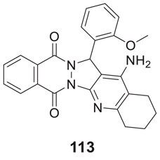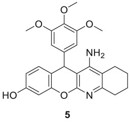 Oset-Gasque et al. developed a non-competitive inhibitor chromenotacrines 5 (11-amino-12-(3,4,5-trimethoxyphenyl)-7,9,10,12-tetrahydro-8H-chromeno [2,3-b]quinolin-3-ol), which is less toxic to human liver cells than tacrine. Compound 5 was identified as a potential AChE inhibitor (IC 50 = 0.041 ± 0.001 µM) binding to the peripheral anionic site. Compound 5 exhibited selective inhibition towards AChE, and kinetic studies revealed moderate brain permeability (Oset-Gasque et al., 2014).