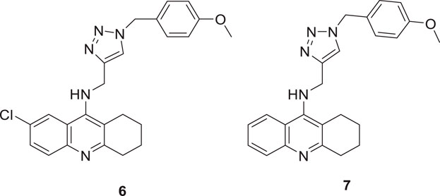 Najafi et al. designed and evaluated new tacrine hybrids introducing triazine substitution at the amine group of tacrine. Compounds 6 (7-chloro-N-((1-(4-methoxybenzyl)-1H-1,2,3-triazol-4-yl)methyl)-1,2,3,4-tetrahydroacridin-9-amine) and 7 (N-((1-(4-methoxybenzyl)-1H-1,2,3-triazol-4-yl)methyl)-1,2,3,4-tetrahydroacridin-9-amine) illustrated anti-cholinesterase activity. Although both compounds 6 and 7 have 4-methoxyphenyl connected to a 1,2,3-triazole moiety, compound 6 with chlorine substitution at 7-position of acridine ring displayed the best AChE inhibitory activity (IC50 = 0.521 ± 0.025 µM), and compound 7 indicated activity against BuChE (IC50 = 0.055 ± 0.012 µM). This reveals that these small structural changes lead to changes in the preferential binding pattern of the enzyme. The compounds were evaluated for neuroprotection and radical scavenging ability. Compound 6 showed moderate neuroprotective activity at 10 mM (cell viability = 65.40% and P < 0.05 vs. H2O2 treatment alone), and both compounds 6 and 7 indicated no notable antioxidant activities. Tacrine-1,2,3-triazole hybrids are considered potential agents with anti-cholinesterase activity (Najafi et al., 2017).