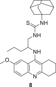Spilovska et al. developed 7-methoxy derivatives, 9-amino-7-methoxy-1,2,3,4-tetrahydro acridine (7-MEOTA) linked with urea and thiourea and amantadine, found less hepatotoxic compared to tacrine. 1-(Adamantan-1-yl)-3-(2-((7-methoxy-1,2,3,4-tetrahydroacridin-9-yl) amino)pentyl)thiourea (8) linked with thiourea from this series showed potent hAChE (IC50 = 0.47 ± 0.09 µM) and BuChE (IC50 = 0.11 ± 0.02 µM) inhibitory activity (Spilovska et al., 2015).