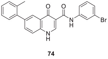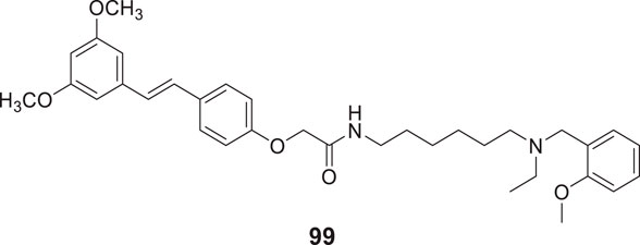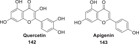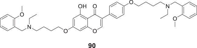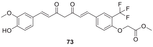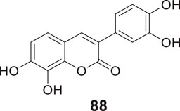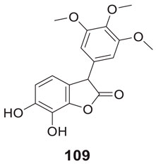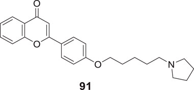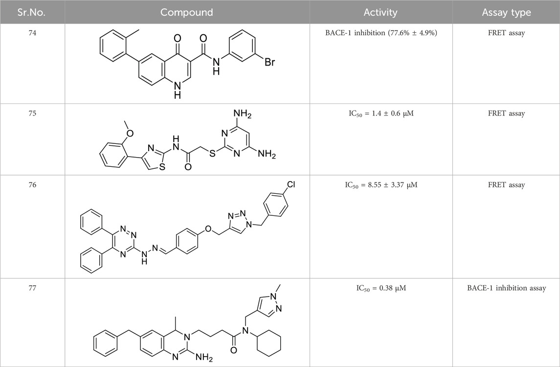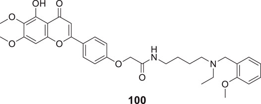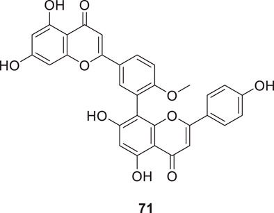 Sirimangkalakitti et al. reported the anti-Alzheimer’s activity of naturally occurring bioflavonoids as β aggregation inhibition. They have studied 27 bioflavonoids with different linkages and methoxy substitution. Among them, flavonoids amentoflavone and its methoxy derivatives show potent inhibition of Aβ aggregation in vitro and bilobetin, 8-(5-(5,7-dihydroxy-4-oxo-4H-chromen-2-yl)-2-methoxyphenyl)-5,7-dihydroxy-2-(4-hydroxyphenyl)-4H-chromen-4-one, (71) displayed an IC50 value of 4.7 µM (Sirimangkalakitti et al., 2019).
