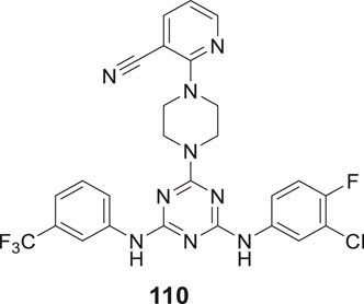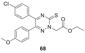 In a separate study by Kucukkilinc et al., co-workers designed, synthesized, and evaluated 5,6-diaryl-1,2,4-triazine-3-thioacetates against Aβ induced neurotoxicity and H2O2 toxicity. The neuroprotective activity of the compounds was evaluated on PC12 and SH-SY5Y cells; surprisingly, ethyl 2-(5-(4-chlorophenyl)-6-(4-methoxyphenyl)-3-thioxo-1,2,4-triazin-2(3H)-yl)acetate (68) was identified as the most potent derivative (EC50 = 14.44 ± 0.85 µM) and was less potent than quercetin (EC50 = 8.18 ± 1.45 µM). Cytometric analysis revealed the possibility of a 40% increase in cell viability in H2O2-induced apoptosis. Furthermore, these compounds also improved neuronal cells neurite outgrowth in transferase-mediated dUTP nick end labelling (TUNEL) assay (Tuylu Kucukkilinc et al., 2017).