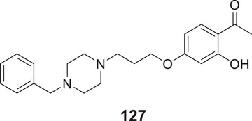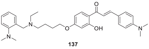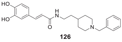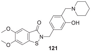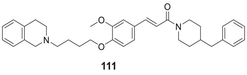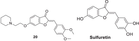 Lee et al. synthesized alkyl-substituted aurone derivative (Z)-2-(3,4-dimethoxybenzylidene)-6-(2-(piperidin-1-yl)ethoxy)benzofuran-3(2H)-one (20) using sulfuretin as a hit molecule. Researchers compared its potency with sulfuretin and galantamine, which have AChE inhibitory activity. Compound 20 displayed good inhibitory activity against AChE (IC50 = 0.40 ± 0.03 µM), was ca. 1700-fold higher than sulfuretin (IC50 = 698.9 μM) and ca. 6-fold higher than galantamine (IC50 = 2.50 μM) (Lee et al., 2015).