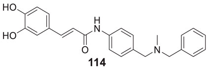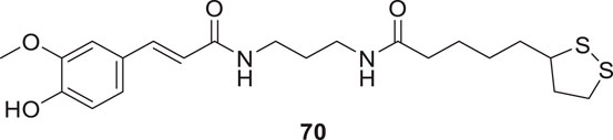 Pagoni et al. synthesized and evaluated 13 novel hybrids of phenols and lipoic acid as Aβ-aggregation inhibitors as well as antioxidant agents. From this series, (E)-5-(1,2-dithiolan-3-yl)-N-(3-(3-(4-hydroxy-3-methoxyphenyl)acrylamido)propyl)pentanamide (70) exhibited in-vitro activity against Aβ-aggregation. Additionally, it also displayed antioxidant properties with cytoprotective and non-cytotoxic action. Ferulic and dihydroxyphenylacetic acid derivatives (structures not shown) as phenolic groups indicate strong free radical scavenging and anti-amyloidogenic properties (Pagoni et al., 2020).